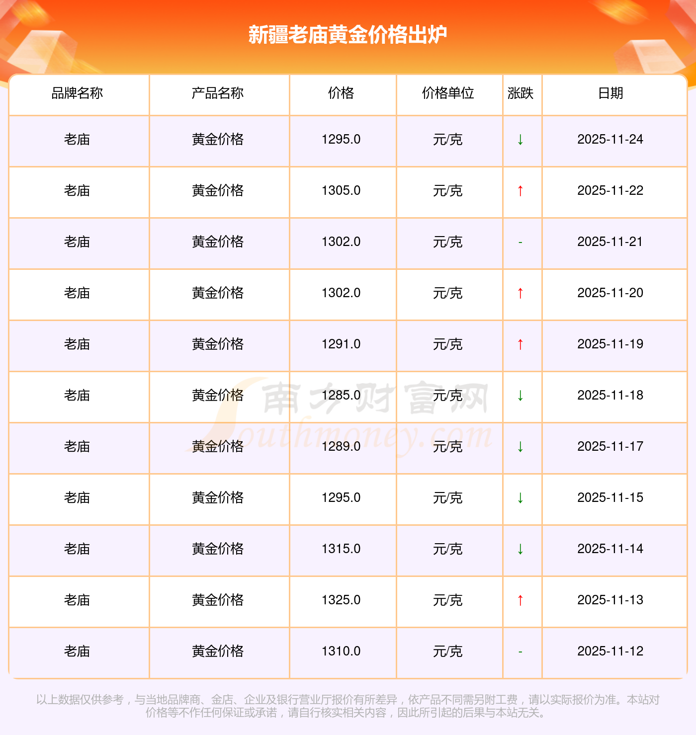 今日(2025年11月24日),新疆老廟黃金價格的價格是1295.0元/克。