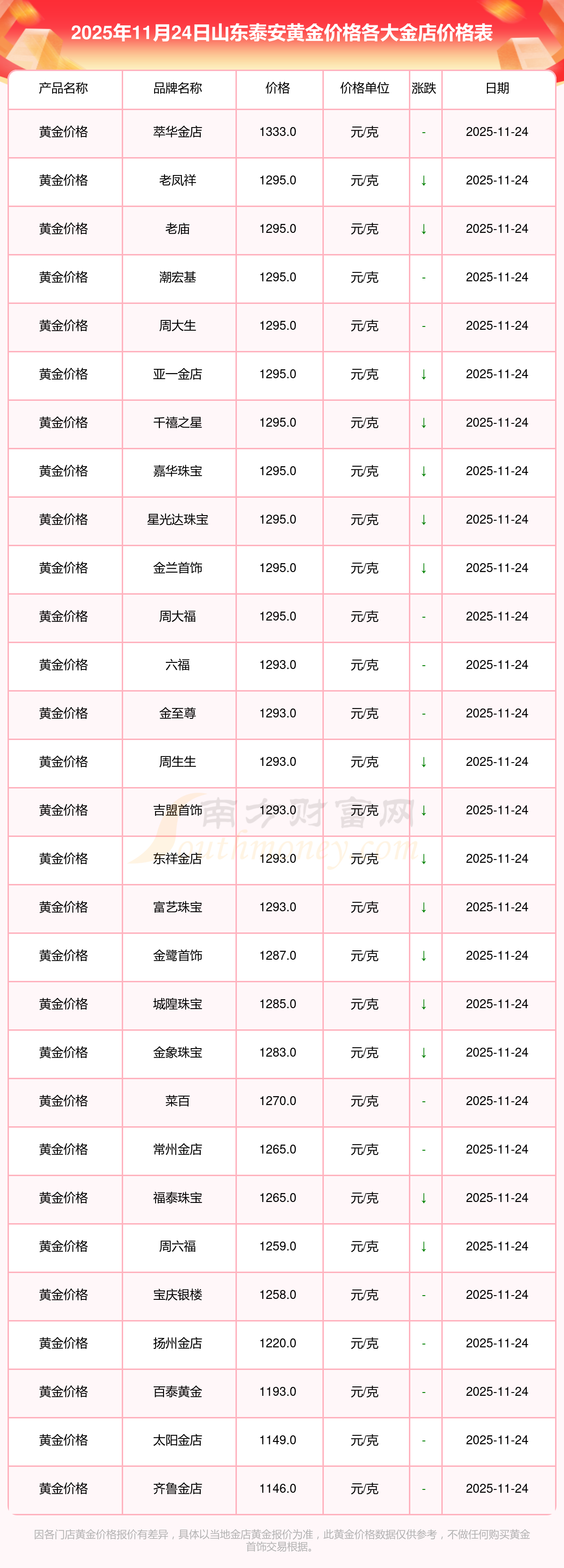 2025年11月24日,山東泰安周大福、周大福、周大福、老鳳祥、老鳳祥、老鳳祥、周六福、周六福、周六福、周六福、六福等各大金店品牌黃金價格今日價格如下:周大福17630.0、周大福40570.0、周大福1134.0元/克、老鳳祥1295.0元/克、老鳳祥600.0元/克、老鳳祥1295.0元/克、周六福1259.0元/克、周六福590.0元/克、周六福590.0元/克、周六福1154.0元/克、六福1293.0元/克。