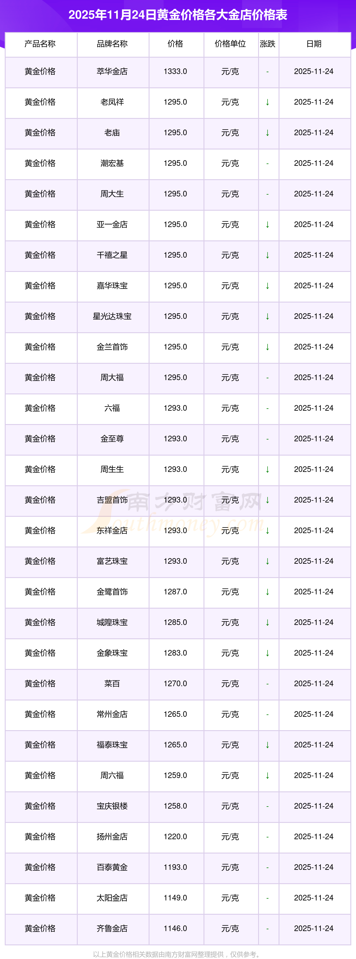 2025年11月24日周大福、周大福、周大福、老鳳祥、老鳳祥、老鳳祥、周六福、周六福、周六福、周六福、六福等各大金店品牌黃金價(jià)格最新價(jià)格如下:周大福鉑金價(jià)格(香港)17630.0,周大福金條價(jià)格(香港)40570.0,周大福金條金價(jià)(內(nèi)地)1134.0元/克,老鳳祥黃金價(jià)格1295.0元/克,老鳳祥鉑金價(jià)格600.0元/克,老鳳祥足金價(jià)格1295.0元/克,周六福黃金價(jià)格1259.0元/克,周六福鉑金價(jià)格590.0元/克,周六福PT999鉑金價(jià)格590.0元/克,周六福金條價(jià)格1154.0元/克,六福黃金價(jià)格1293.0元/克。
