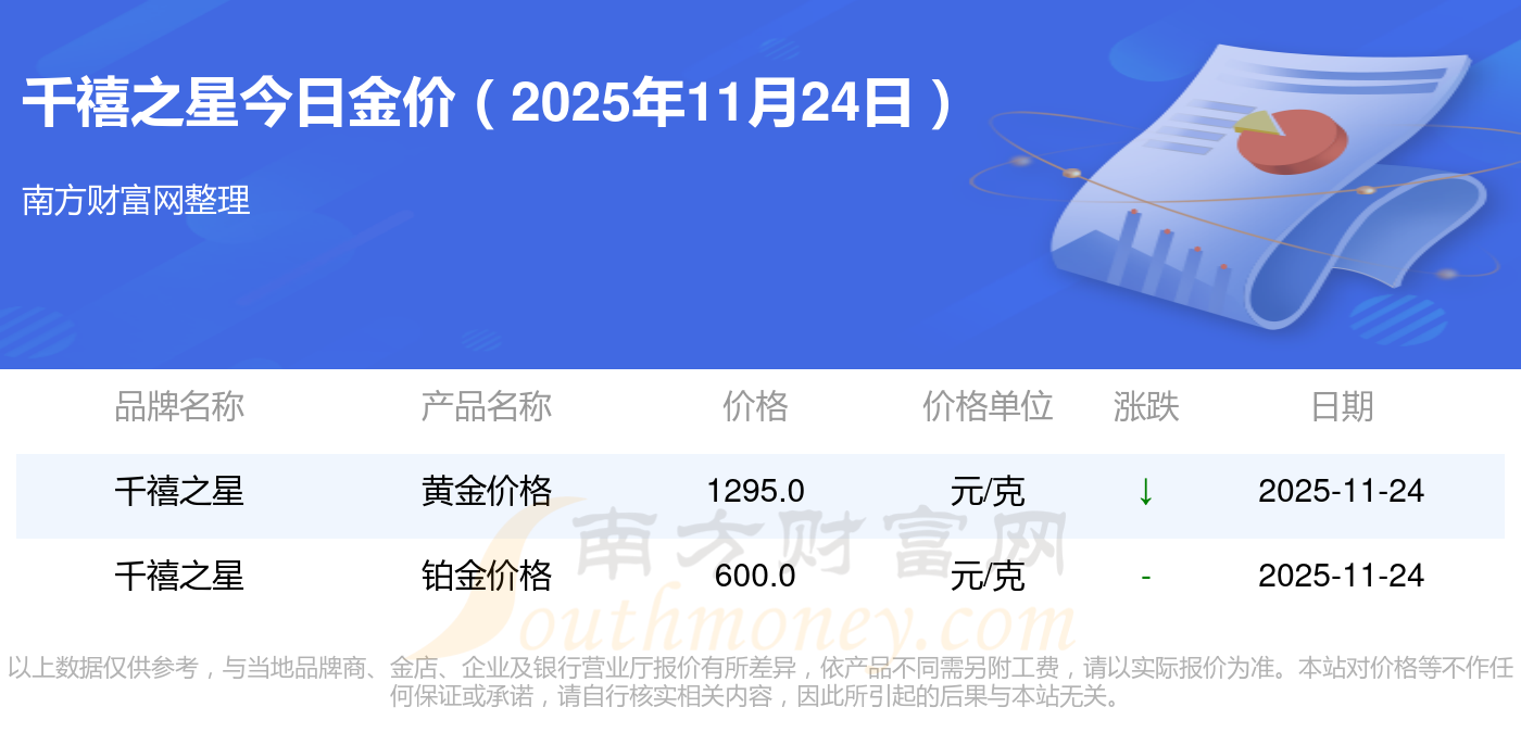 2025年11月24日千禧之星最新價(jià)格:鉑金價(jià)格(香港)17630.0,金條價(jià)格(香港)40570.0,金條金價(jià)(內(nèi)地)1134.0元/克,黃金價(jià)格1295.0元/克,鉑金價(jià)格600.0元/克,足金價(jià)格1295.0元/克,黃金價(jià)格1259.0元/克,鉑金價(jià)格590.0元/克,PT999鉑金價(jià)格590.0元/克,金條價(jià)格1154.0元/克,黃金價(jià)格1293.0元/克。