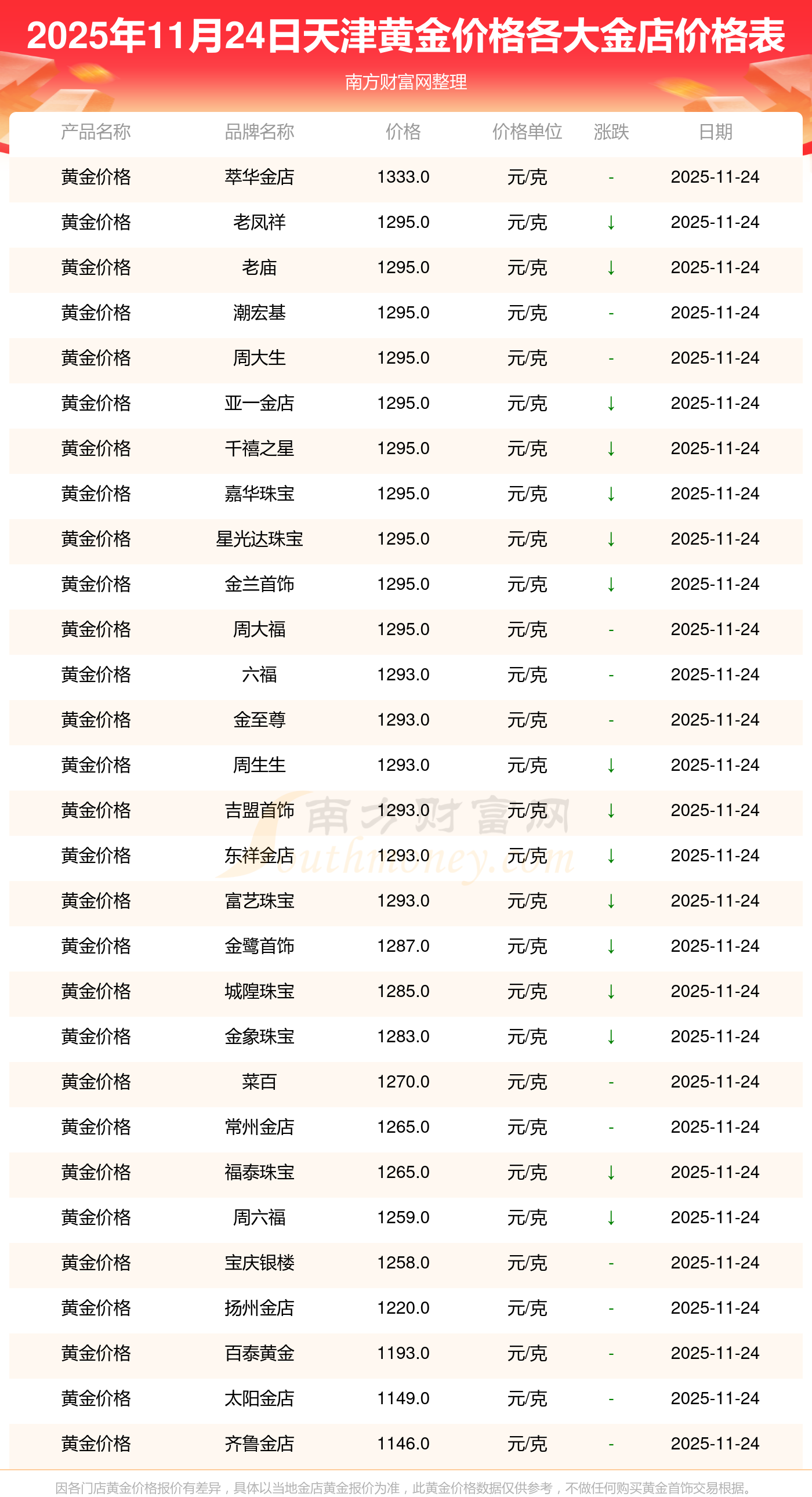2025年11月24日,天津周大福、周大福、周大福、老鳳祥、老鳳祥、老鳳祥、周六福、周六福、周六福、周六福、六福等各大金店品牌黃金價(jià)格今日價(jià)格行情最新來(lái)了:周大福17630.0、周大福40570.0、周大福1134.0元/克、老鳳祥1295.0元/克、老鳳祥600.0元/克、老鳳祥1295.0元/克、周六福1259.0元/克、周六福590.0元/克、周六福590.0元/克、周六福1154.0元/克、六福1293.0元/克。
