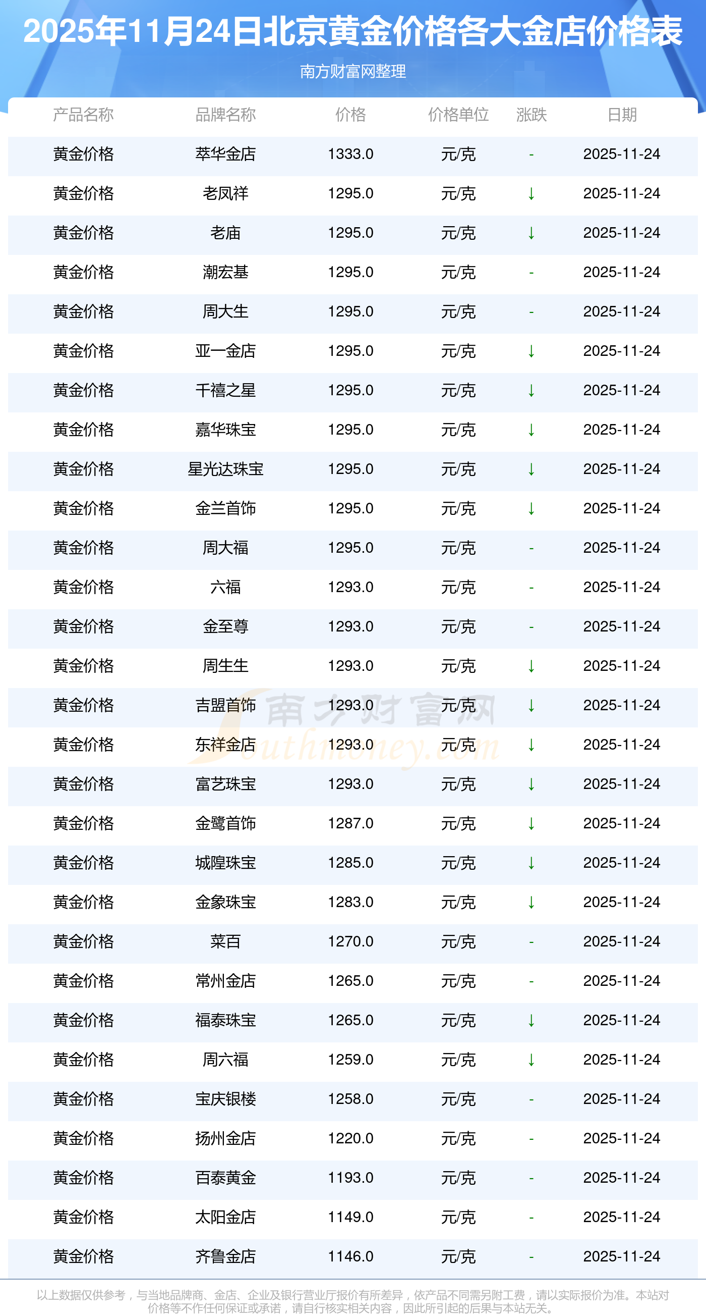 2025年11月24日,北京周大福、周大福、周大福、老鳳祥、老鳳祥、老鳳祥、周六福、周六福、周六福、周六福、六福等各大金店品牌黃金價(jià)格今日價(jià)格行情最新來了:周大福17630.0、周大福40570.0、周大福1134.0元/克、老鳳祥1295.0元/克、老鳳祥600.0元/克、老鳳祥1295.0元/克、周六福1259.0元/克、周六福590.0元/克、周六福590.0元/克、周六福1154.0元/克、六福1293.0元/克。