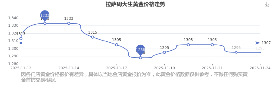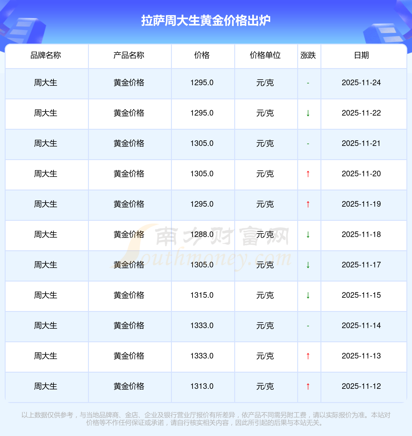今日2025年11月24日,拉薩周大生黃金價(jià)格為1295.0元/克。