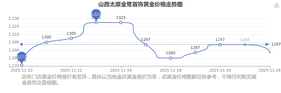 今日(2025年11月24日),山西太原金鷺首飾黃金價格每克的價值為1287.0元/克。