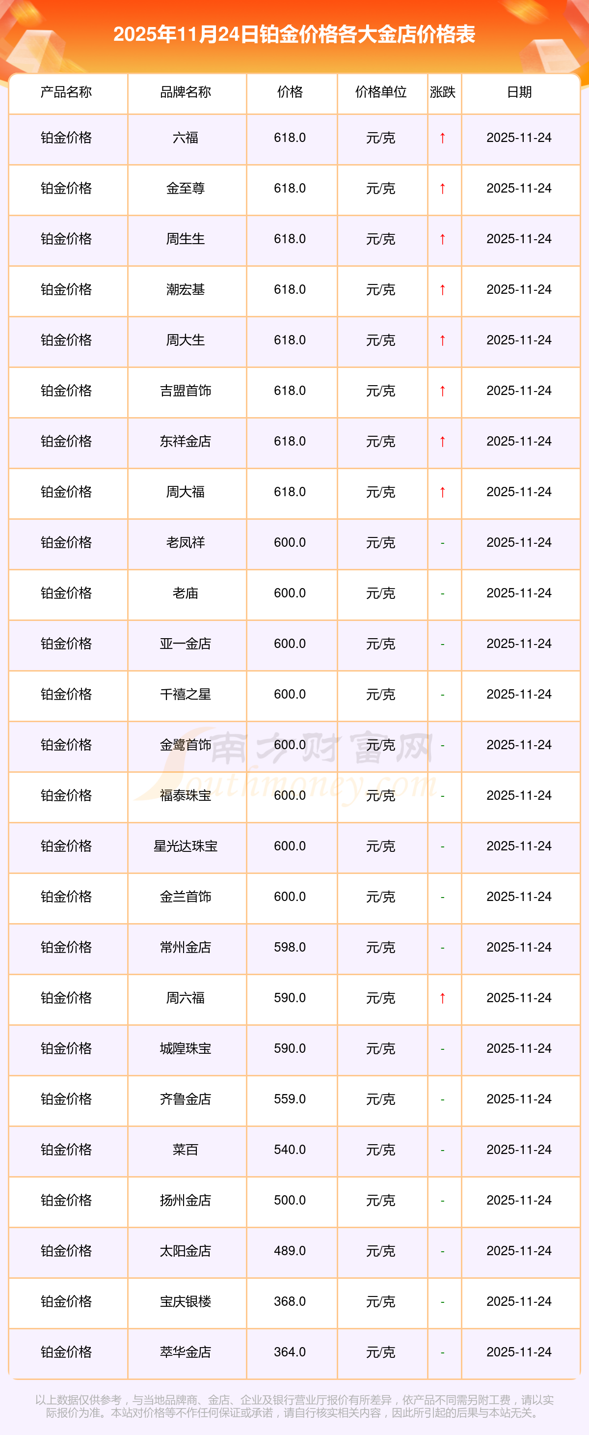 今天是2025年11月24日,周大福、周大福、周大福、老鳳祥、老鳳祥、老鳳祥、周六福、周六福、周六福、周六福、六福等各大金店品牌鉑金價格最新價格如下:周大福17630.0、周大福40570.0、周大福1134.0元/克、老鳳祥1295.0元/克、老鳳祥600.0元/克、老鳳祥1295.0元/克、周六福1259.0元/克、周六福590.0元/克、周六福590.0元/克、周六福1154.0元/克、六福1293.0元/克。