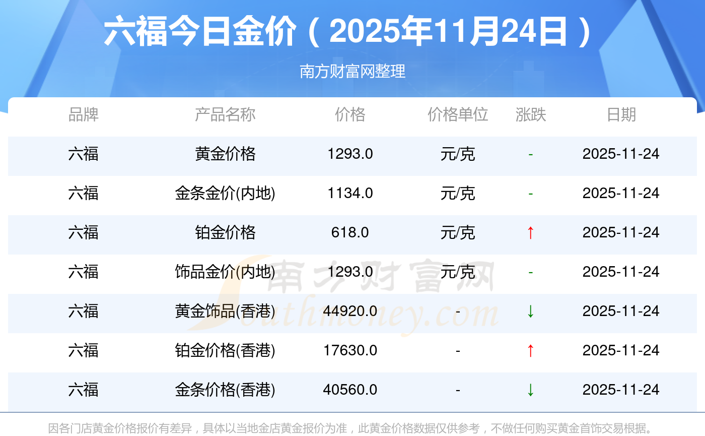 現(xiàn)在六福黃金價格是多少錢1克_2025年六福今日金價是多少錢一克,最新六福查詢,2025年11月24日六福飾品金價(內(nèi)地)現(xiàn)在每克多少錢?最新六福飾品金價(內(nèi)地)報價公布,一起來看看吧!