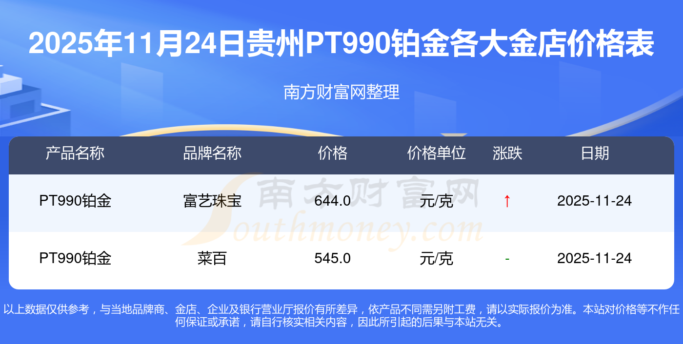 今天是2025年11月24日,貴州周大福、周大福、周大福、老鳳祥、老鳳祥、老鳳祥、周六福、周六福、周六福、周六福、六福等各大金店品牌PT990鉑金最新價(jià)格如下:周大福17630.0、周大福40570.0、周大福1134.0元/克、老鳳祥1295.0元/克、老鳳祥600.0元/克、老鳳祥1295.0元/克、周六福1259.0元/克、周六福590.0元/克、周六福590.0元/克、周六福1154.0元/克、六福1293.0元/克。