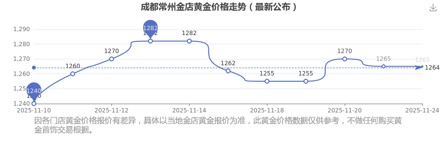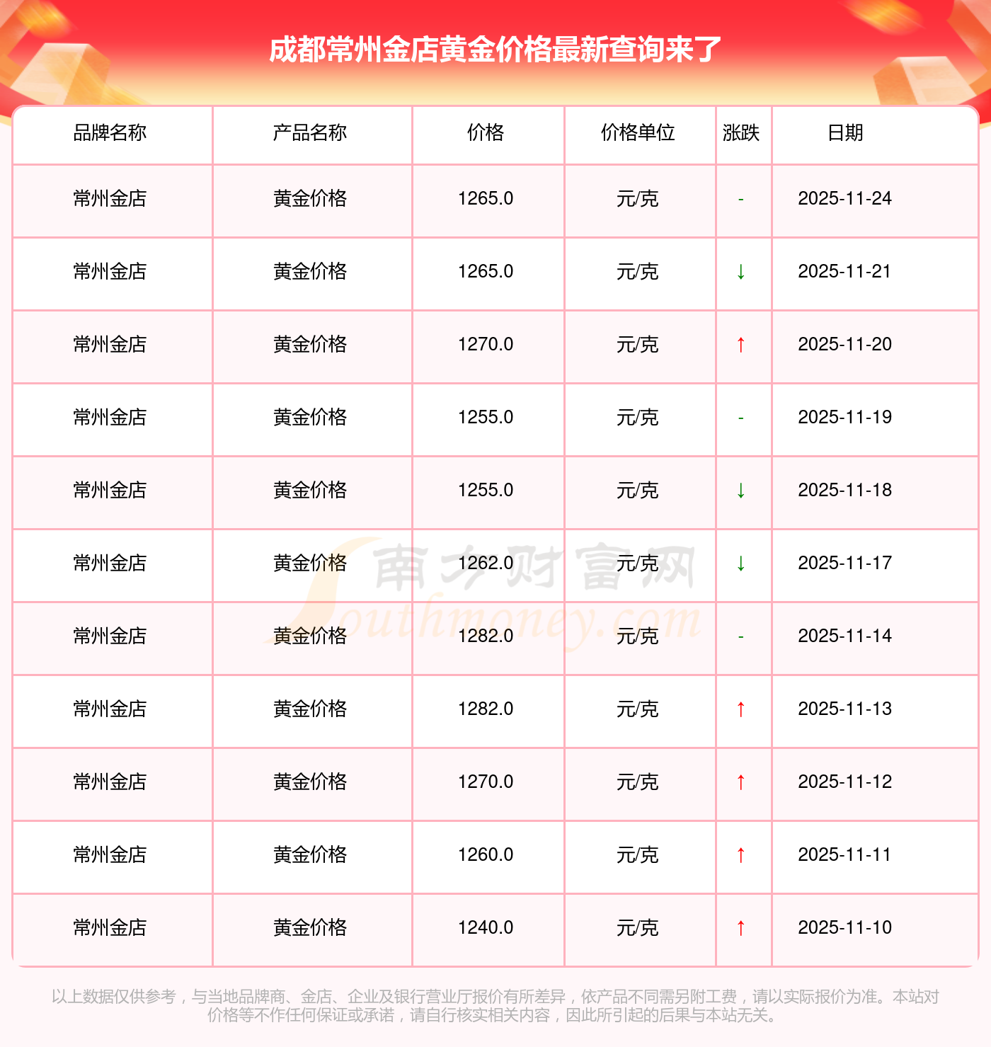 (2025年11月24日)今日成都常州金店黃金價(jià)格是1265.0元/克。