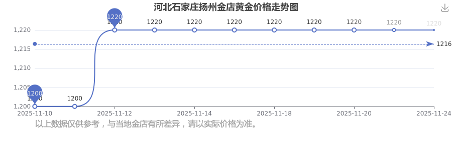 河北石家莊揚州金店現(xiàn)在黃金價格每克多少?想了解今天黃金一克的行情價是多少錢?今日河北石家莊揚州金店黃金價格查詢,2025年11月24日,河北石家莊揚州金店黃金價格每克的售賣價位為1220.0元/克。