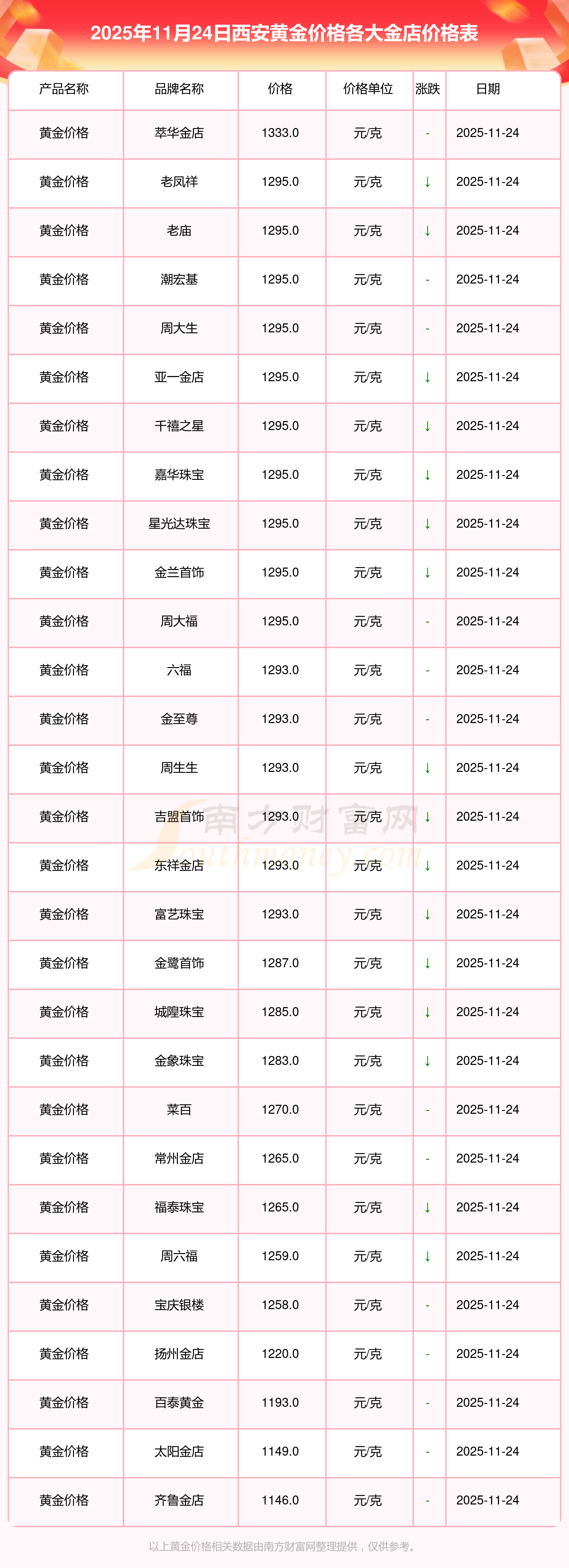 今天是2025年11月24日,西安周大福、周大福、周大福、老鳳祥、老鳳祥、老鳳祥、周六福、周六福、周六福、周六福、六福等各大金店品牌黃金價(jià)格最新價(jià)格如下:周大福17630.0、周大福40570.0、周大福1134.0元/克、老鳳祥1295.0元/克、老鳳祥600.0元/克、老鳳祥1295.0元/克、周六福1259.0元/克、周六福590.0元/克、周六福590.0元/克、周六福1154.0元/克、六福1293.0元/克。