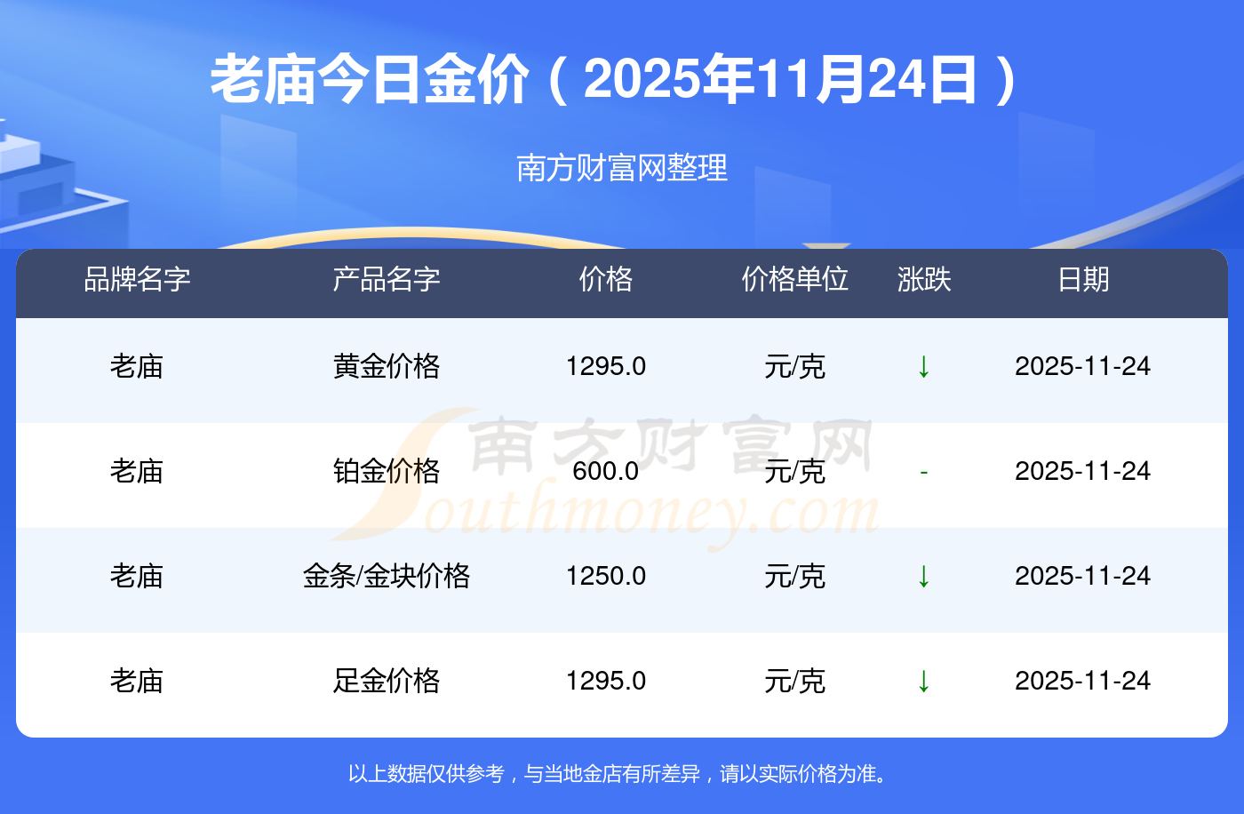 鉑金價格(香港)17630.0,金條價格(香港)40570.0,金條金價(內(nèi)地)1134.0元/克,黃金價格1295.0元/克,鉑金價格600.0元/克,足金價格1295.0元/克,黃金價格1259.0元/克,鉑金價格590.0元/克,PT999鉑金價格590.0元/克,金條價格1154.0元/克,黃金價格1293.0元/克。