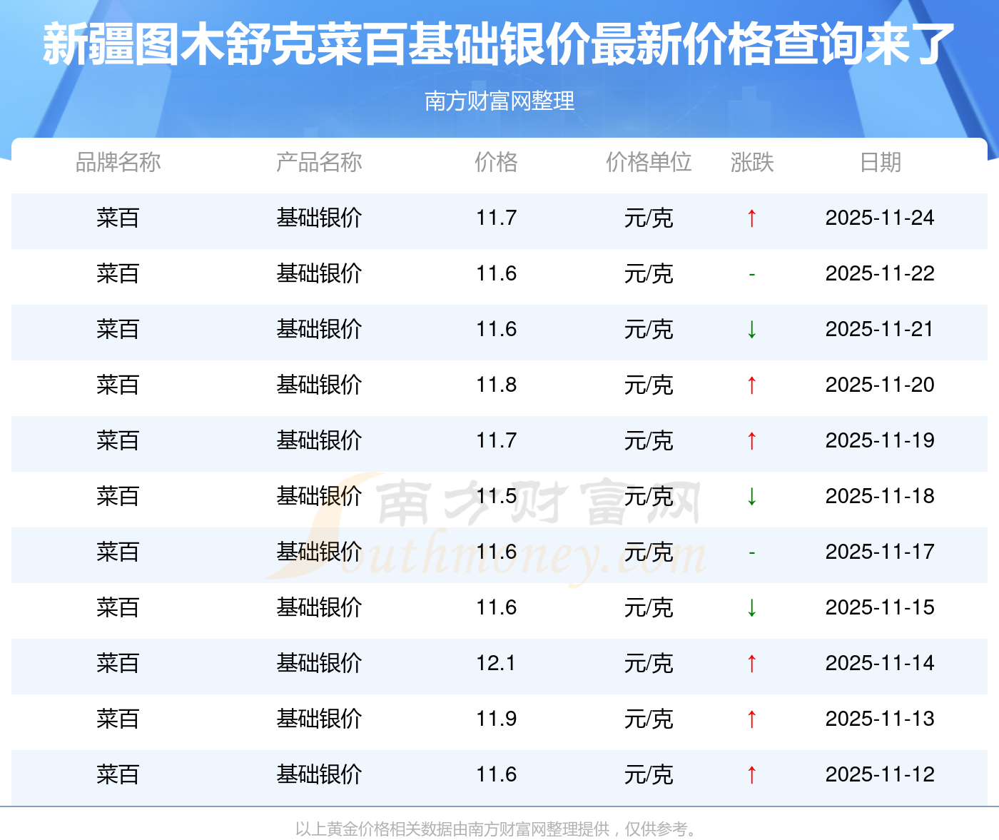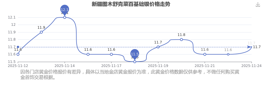 新疆圖木舒克菜百的基礎(chǔ)銀價在今日(2025年11月24日),每克售價為11.7元/克。