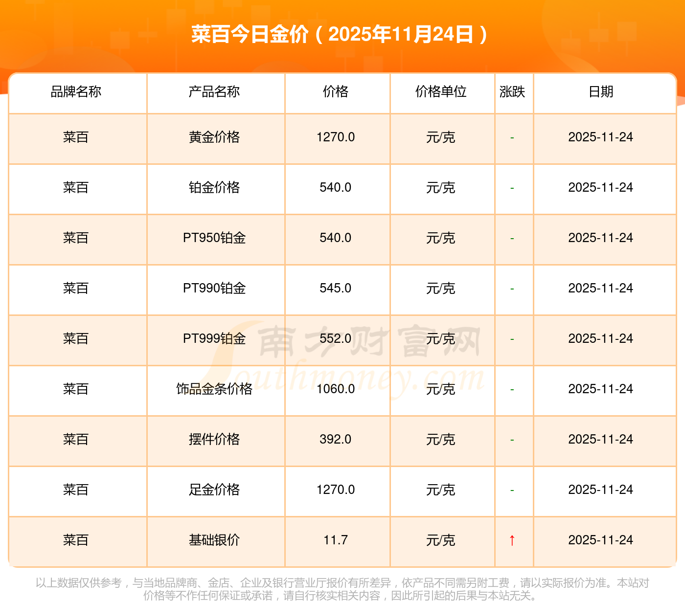 2025年11月24日各大金店P(guān)T950鉑金最新價格:周大福17630.0,周大福40570.0,周大福1134.0元/克,老鳳祥1295.0元/克,老鳳祥600.0元/克,老鳳祥1295.0元/克,周六福1259.0元/克,周六福590.0元/克,周六福590.0元/克,周六福1154.0元/克,六福1293.0元/克。