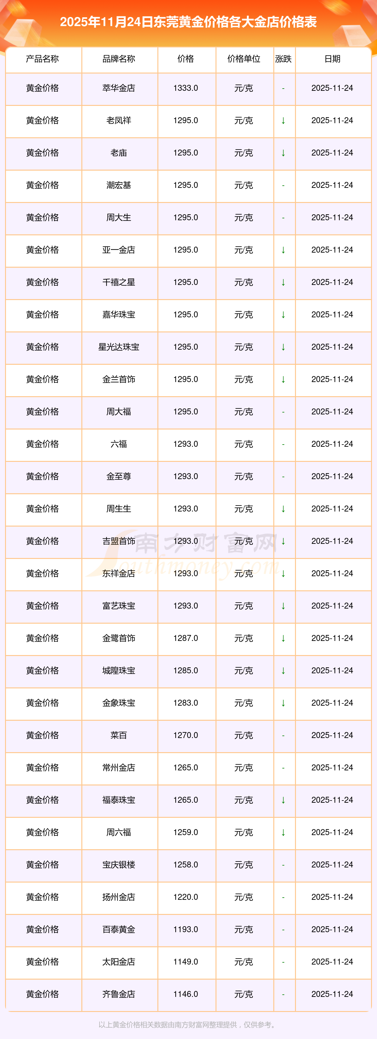 今天是2025年11月24日,東莞周大福、周大福、周大福、老鳳祥、老鳳祥、老鳳祥、周六福、周六福、周六福、周六福、六福等各大金店品牌黃金價格最新價格如下:周大福17630.0、周大福40570.0、周大福1134.0元/克、老鳳祥1295.0元/克、老鳳祥600.0元/克、老鳳祥1295.0元/克、周六福1259.0元/克、周六福590.0元/克、周六福590.0元/克、周六福1154.0元/克、六福1293.0元/克。