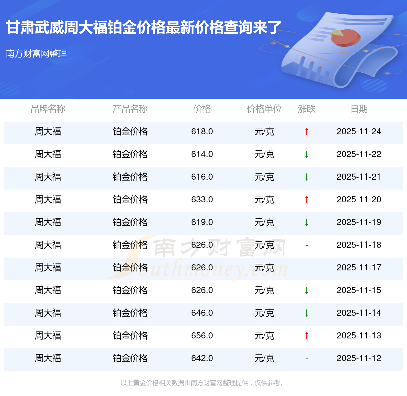 2025年11月24日周大福、周大福、周大福、老鳳祥、老鳳祥、老鳳祥、周六福、周六福、周六福、周六福、六福等各大金店品牌鉑金價(jià)格最新價(jià)格如下:周大福鉑金價(jià)格(香港)17630.0,周大福金條價(jià)格(香港)40570.0,周大福金條金價(jià)(內(nèi)地)1134.0元/克,老鳳祥黃金價(jià)格1295.0元/克,老鳳祥鉑金價(jià)格600.0元/克,老鳳祥足金價(jià)格1295.0元/克,周六福黃金價(jià)格1259.0元/克,周六福鉑金價(jià)格590.0元/克,周六福PT999鉑金價(jià)格590.0元/克,周六福金條價(jià)格1154.0元/克,六福黃金價(jià)格1293.0元/克。