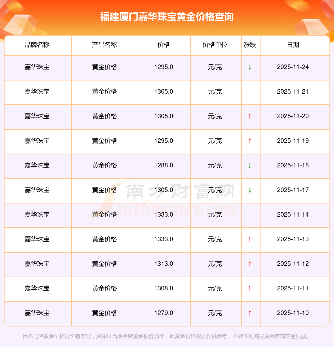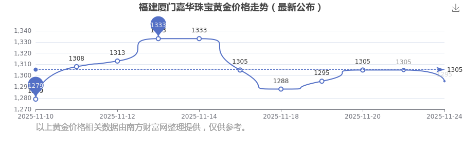 今日(2025年11月24日),福建廈門嘉華珠寶黃金價(jià)格:1295.0元/克。