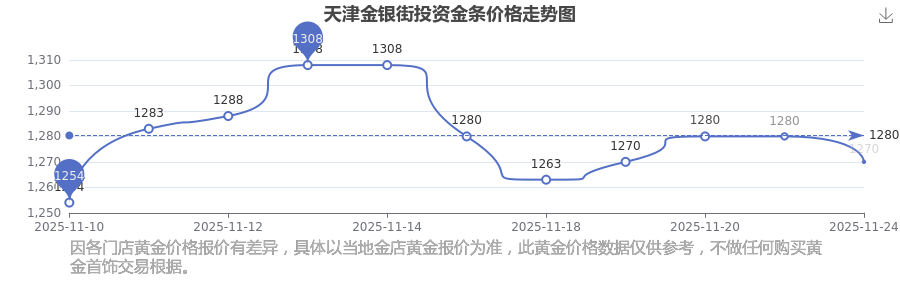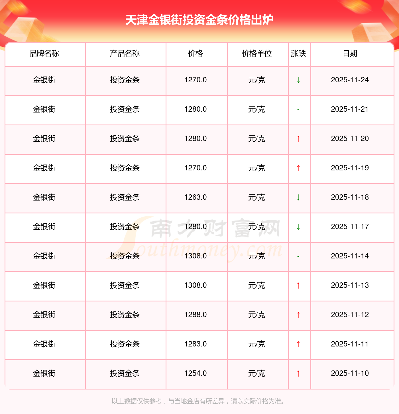 天津金銀街在 2025年11月24日的投資金條零售價(jià)格為 1270.0元/克。