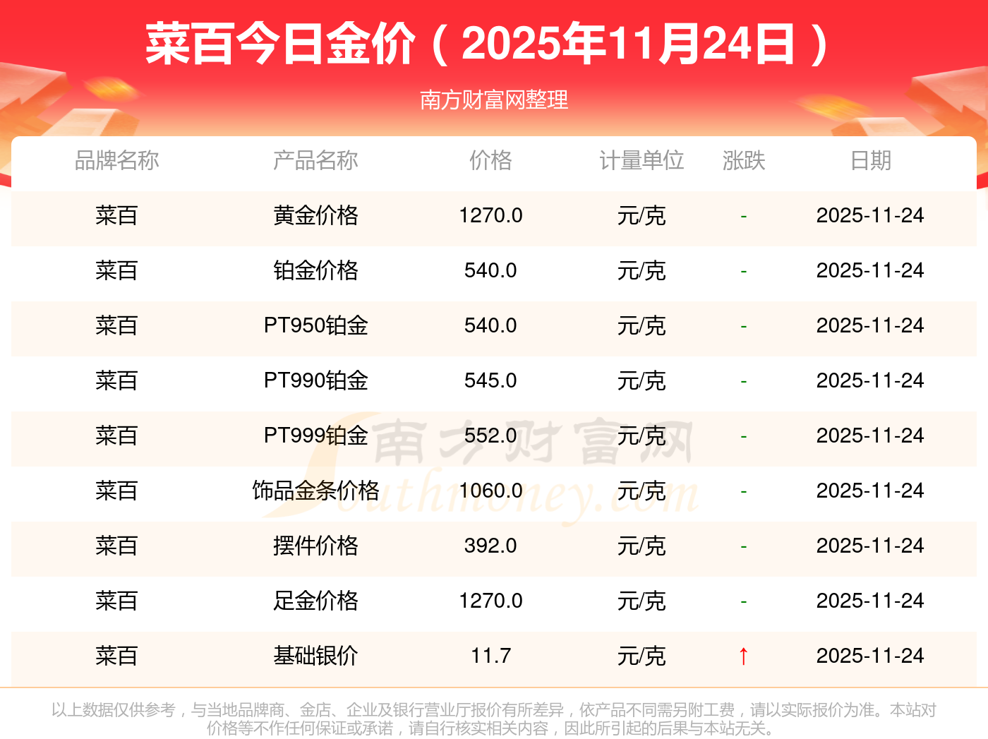 2025年11月24日菜百今日價(jià)格:鉑金價(jià)格(香港)17630.0,金條價(jià)格(香港)40570.0,金條金價(jià)(內(nèi)地)1134.0元/克,黃金價(jià)格1295.0元/克,鉑金價(jià)格600.0元/克,足金價(jià)格1295.0元/克,黃金價(jià)格1259.0元/克,鉑金價(jià)格590.0元/克,PT999鉑金價(jià)格590.0元/克,金條價(jià)格1154.0元/克,黃金價(jià)格1293.0元/克。