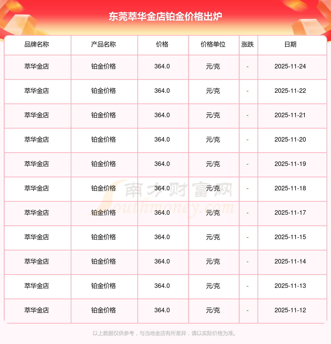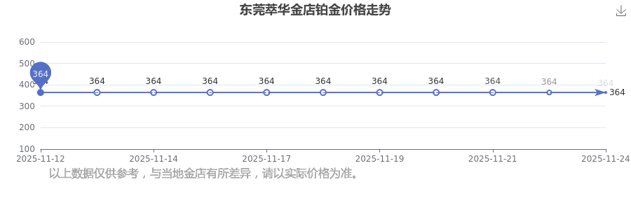 今日(2025年11月24日)東莞萃華金店鉑金價(jià)格為364.0元/克。