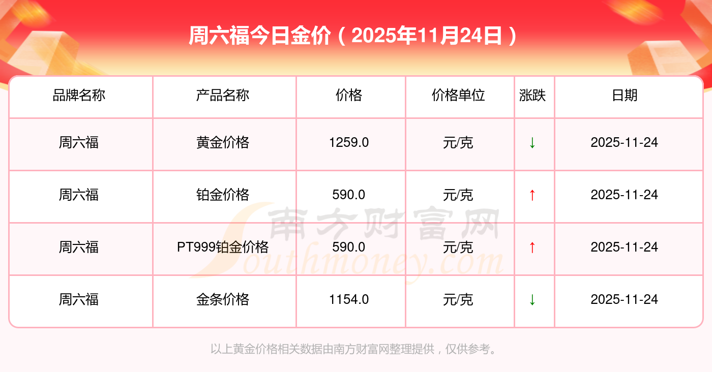 2025年11月24日各大金店金條價(jià)格最新價(jià)格:周大福17630.0,周大福40570.0,周大福1134.0元/克,老鳳祥1295.0元/克,老鳳祥600.0元/克,老鳳祥1295.0元/克,周六福1259.0元/克,周六福590.0元/克,周六福590.0元/克,周六福1154.0元/克,六福1293.0元/克。