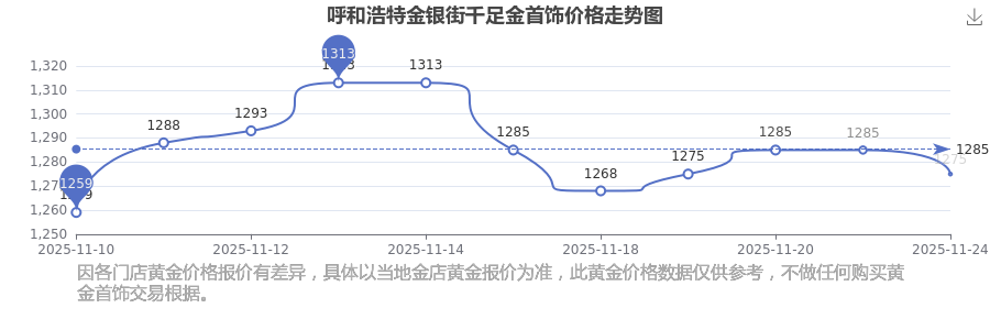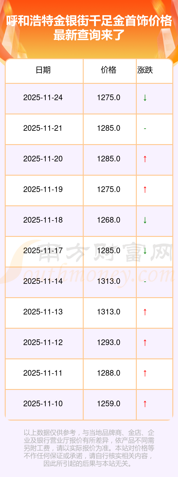 今日呼和浩特金銀街千足金首飾價(jià)格是1275.0元/克。
