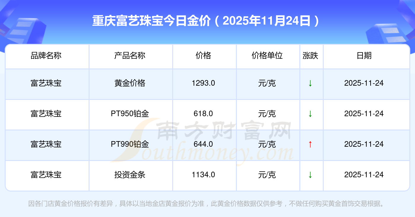 今日黃金價格是怎樣的?當下黃金一克要賣多少錢?2025年11月24日重慶富藝珠寶今日價格:鉑金價格(香港)17630.0,金條價格(香港)40570.0,金條金價(內(nèi)地)1134.0元/克,黃金價格1295.0元/克,鉑金價格600.0元/克,足金價格1295.0元/克,黃金價格1259.0元/克,鉑金價格590.0元/克,PT999鉑金價格590.0元/克,金條價格1154.0元/克,黃金價格1293.0元/克。