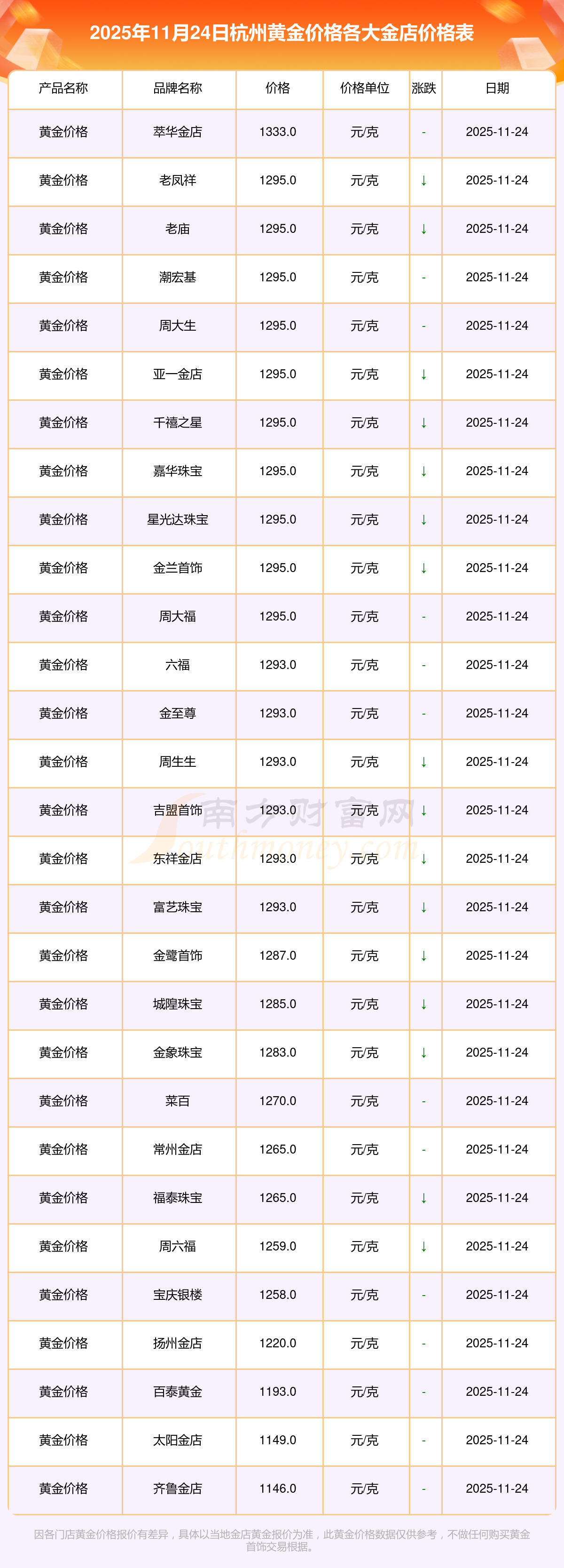 2025年11月24日杭州各大金店黃金價格最新價格:周大福17630.0,周大福40570.0,周大福1134.0元/克,老鳳祥1295.0元/克,老鳳祥600.0元/克,老鳳祥1295.0元/克,周六福1259.0元/克,周六福590.0元/克,周六福590.0元/克,周六福1154.0元/克,六福1293.0元/克。