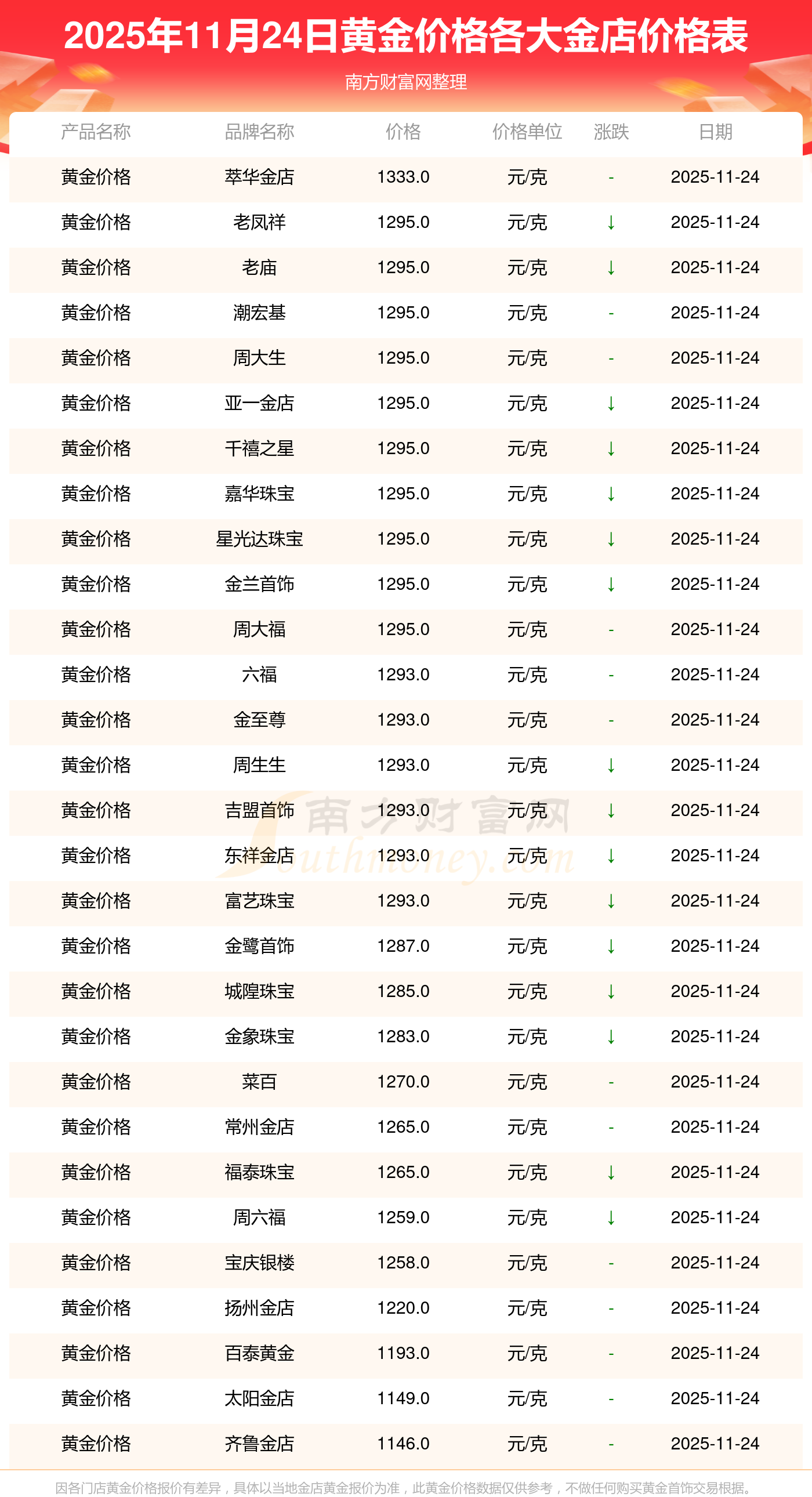 2025年11月24日各大金店黃金價格最新價格:周大福17630.0,周大福40570.0,周大福1134.0元/克,老鳳祥1295.0元/克,老鳳祥600.0元/克,老鳳祥1295.0元/克,周六福1259.0元/克,周六福590.0元/克,周六福590.0元/克,周六福1154.0元/克,六福1293.0元/克。