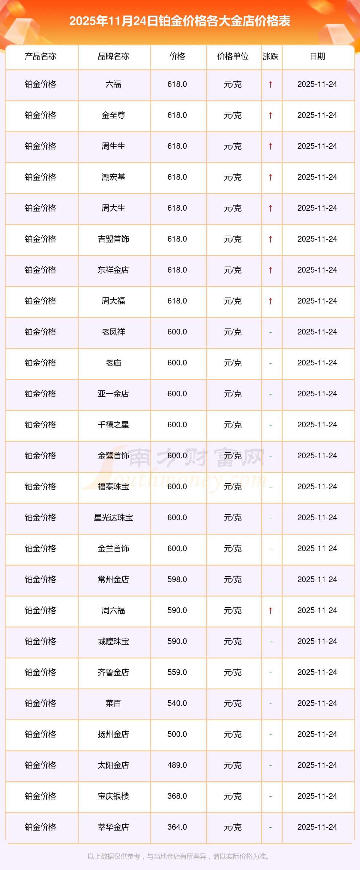 2025年11月24日各大金店鉑金價格最新價格:周大福17630.0,周大福40570.0,周大福1134.0元/克,老鳳祥1295.0元/克,老鳳祥600.0元/克,老鳳祥1295.0元/克,周六福1259.0元/克,周六福590.0元/克,周六福590.0元/克,周六福1154.0元/克,六福1293.0元/克。