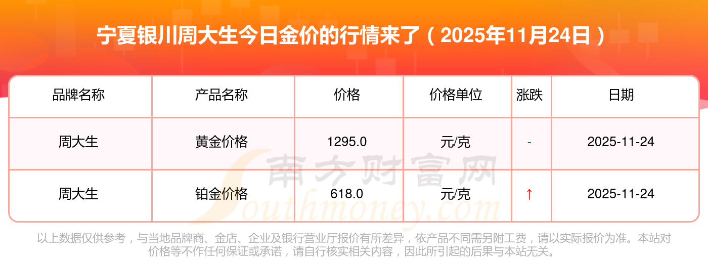 2025年11月24日寧夏銀川周大生現(xiàn)在購買一克黃金需要支付多少錢?鉑金價(jià)格(香港)17630.0,金條價(jià)格(香港)40570.0,金條金價(jià)(內(nèi)地)1134.0元/克,黃金價(jià)格1295.0元/克,鉑金價(jià)格600.0元/克,足金價(jià)格1295.0元/克,黃金價(jià)格1259.0元/克,鉑金價(jià)格590.0元/克,PT999鉑金價(jià)格590.0元/克,金條價(jià)格1154.0元/克,黃金價(jià)格1293.0元/克。