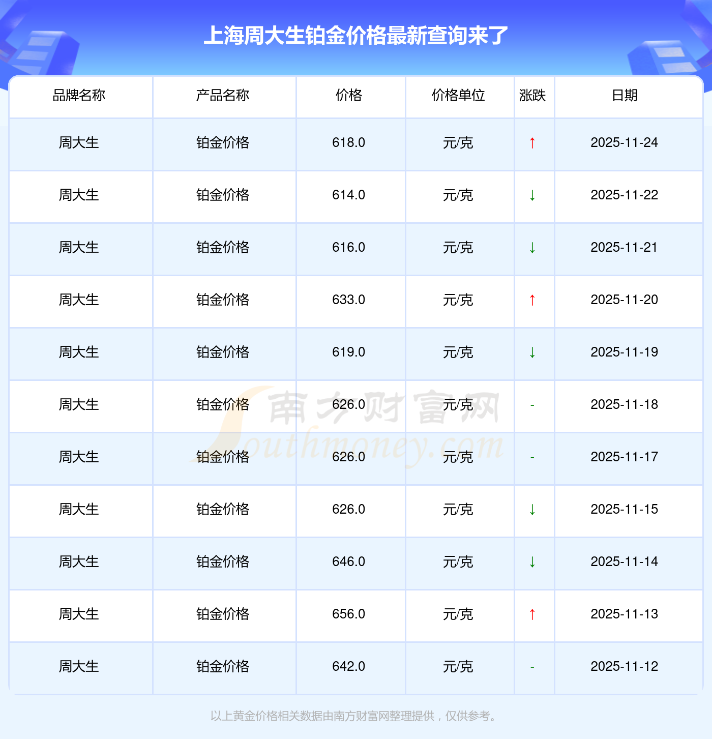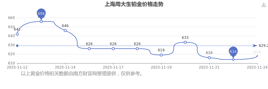 今日(2025年11月24日)上海周大生鉑金價格是618.0元/克。