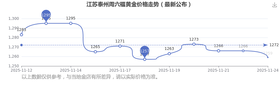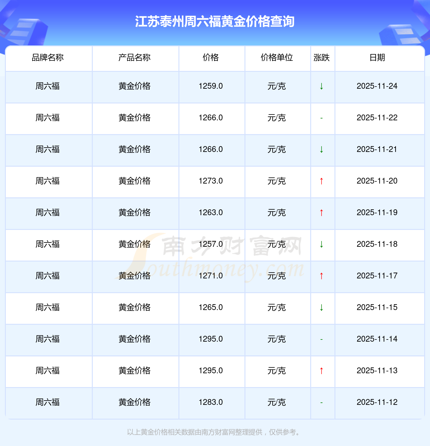 (2025年11月24日)今日江蘇泰州周六福黃金價格是1259.0元/克。
