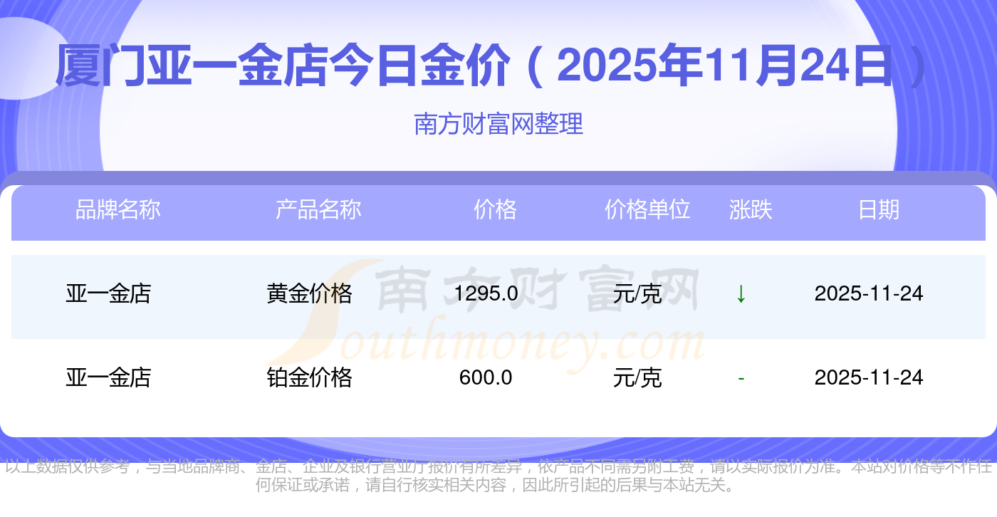 今日黃金售價是多少呢?此刻每克黃金價錢怎樣?2025年11月24日廈門亞一金店黃金一克的市場行情價是多少?鉑金價格(香港)17630.0,金條價格(香港)40570.0,金條金價(內(nèi)地)1134.0元/克,黃金價格1295.0元/克,鉑金價格600.0元/克,足金價格1295.0元/克,黃金價格1259.0元/克,鉑金價格590.0元/克,PT999鉑金價格590.0元/克,金條價格1154.0元/克,黃金價格1293.0元/克。