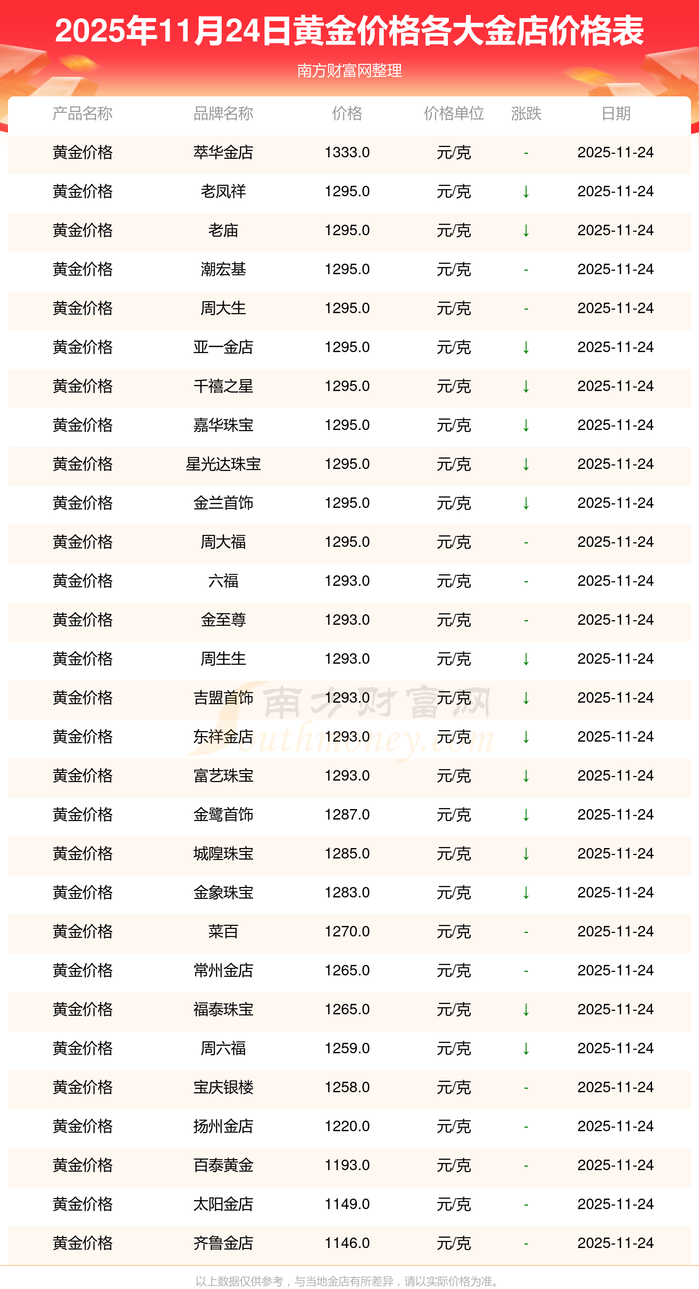 2025年11月24日各大金店黃金價格多少1克?各大金店黃金價格報價表