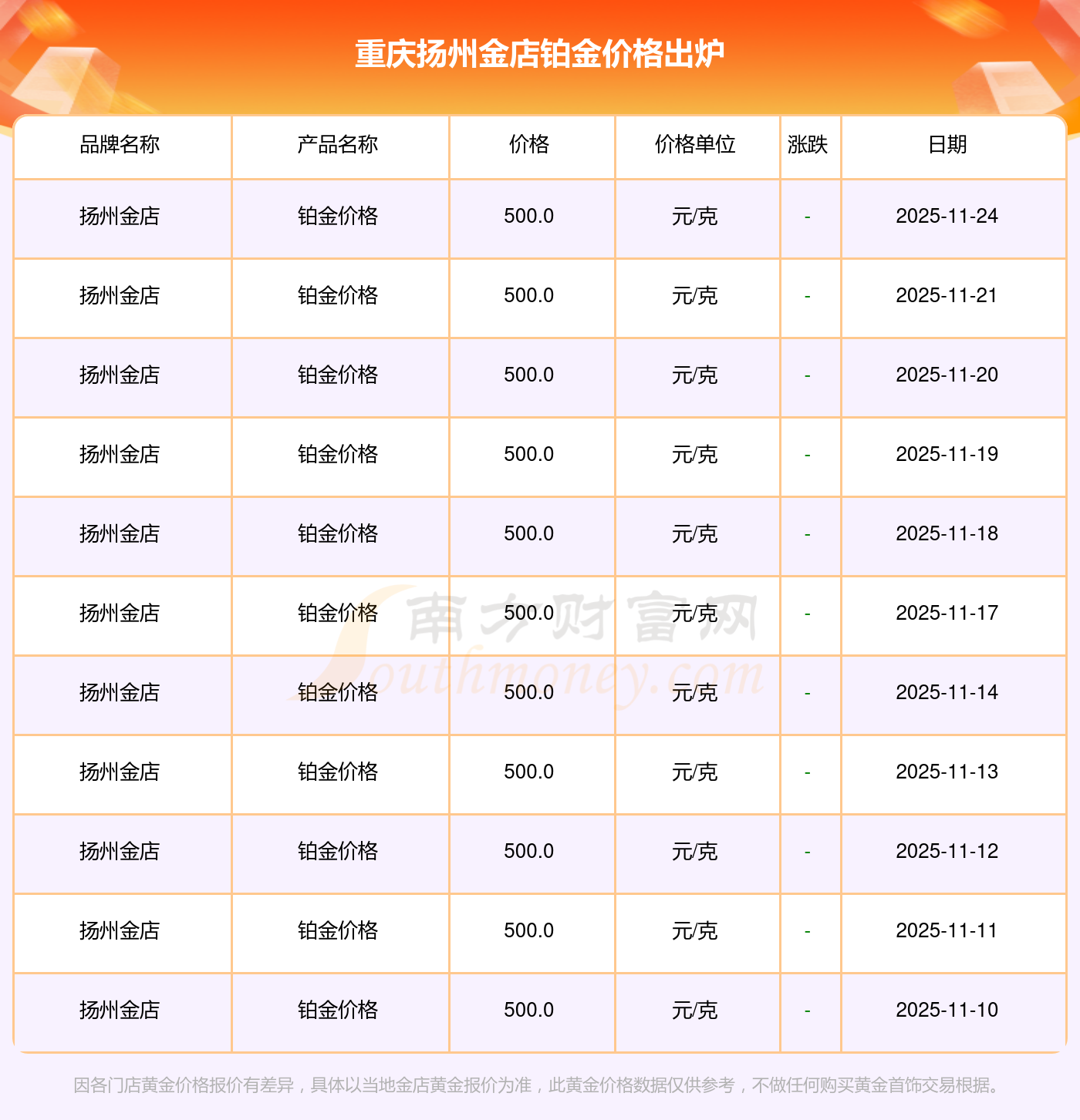 今日重慶揚(yáng)州金店鉑金價(jià)格最新為:500.0元/克。