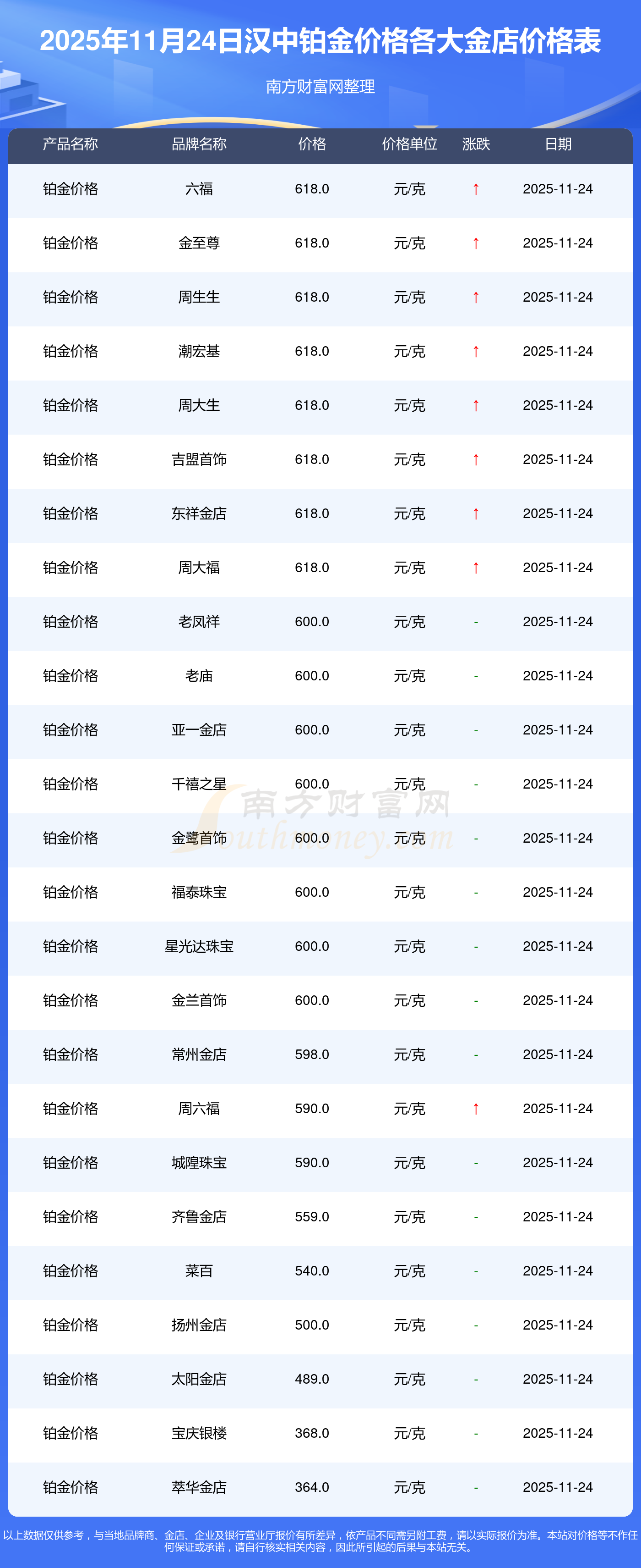 2025年11月24日漢中周大福、周大福、周大福、老鳳祥、老鳳祥、老鳳祥、周六福、周六福、周六福、周六福、六福等各大金店品牌鉑金價格最新價格行情來了,如下:周大福鉑金價格(香港)17630.0,周大福金條價格(香港)40570.0,周大福金條金價(內地)1134.0元/克,老鳳祥黃金價格1295.0元/克,老鳳祥鉑金價格600.0元/克,老鳳祥足金價格1295.0元/克,周六福黃金價格1259.0元/克,周六福鉑金價格590.0元/克,周六福PT999鉑金價格590.0元/克,周六福金條價格1154.0元/克,六福黃金價格1293.0元/克。