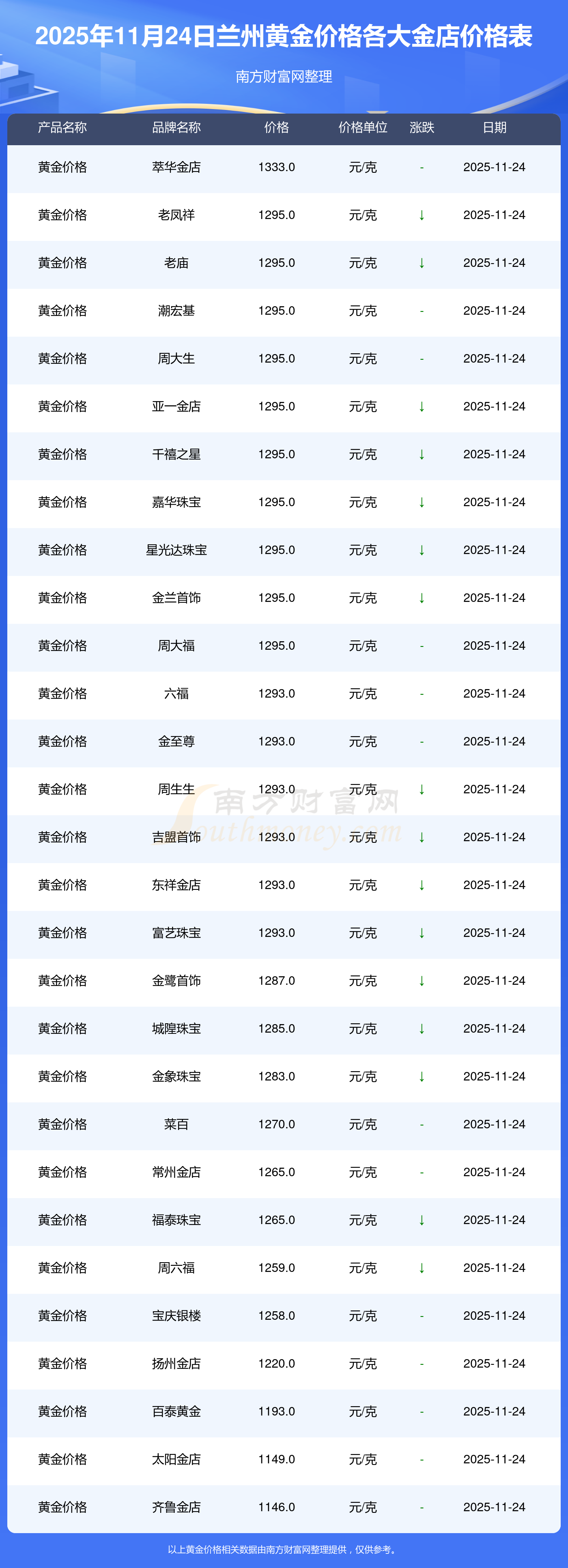 2025年11月24日,蘭州周大福、周大福、周大福、老鳳祥、老鳳祥、老鳳祥、周六福、周六福、周六福、周六福、六福等各大金店品牌黃金價格今日價格如下:周大福17630.0、周大福40570.0、周大福1134.0元/克、老鳳祥1295.0元/克、老鳳祥600.0元/克、老鳳祥1295.0元/克、周六福1259.0元/克、周六福590.0元/克、周六福590.0元/克、周六福1154.0元/克、六福1293.0元/克。