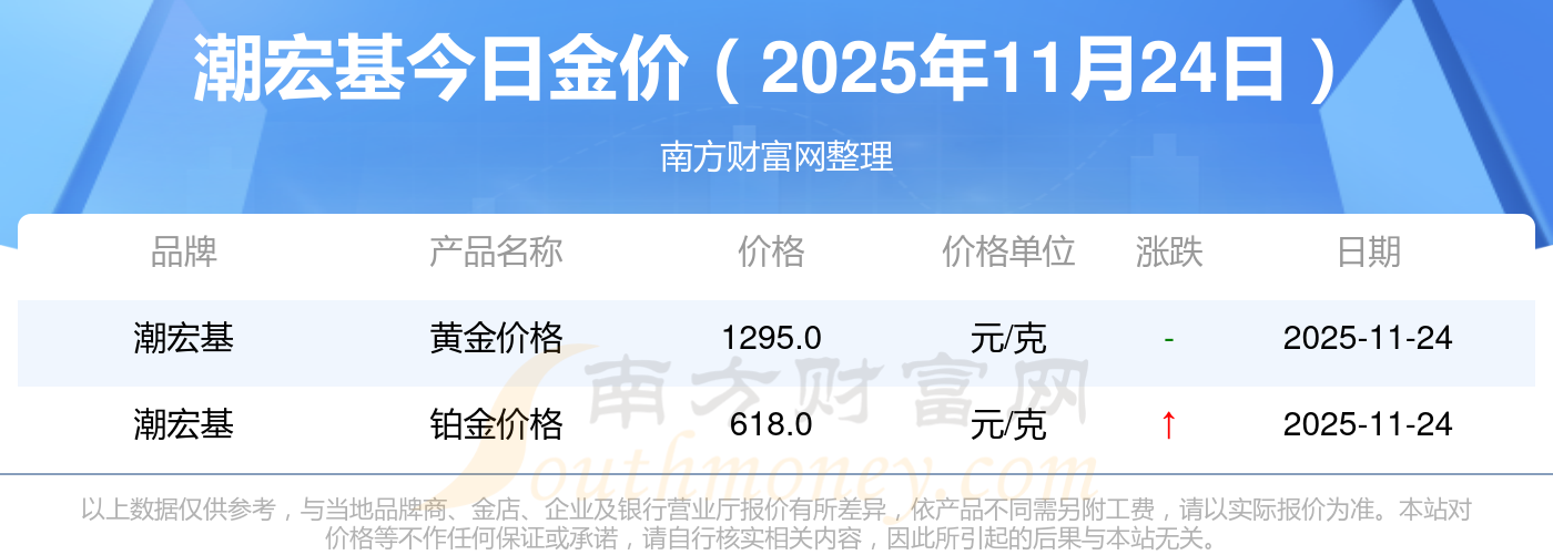 2025年11月24日周大福、周大福、周大福、老鳳祥、老鳳祥、老鳳祥、周六福、周六福、周六福、周六福、六福等各大金店品牌黃金價格最新價格如下:周大福鉑金價格(香港)17630.0,周大福金條價格(香港)40570.0,周大福金條金價(內地)1134.0元/克,老鳳祥黃金價格1295.0元/克,老鳳祥鉑金價格600.0元/克,老鳳祥足金價格1295.0元/克,周六福黃金價格1259.0元/克,周六福鉑金價格590.0元/克,周六福PT999鉑金價格590.0元/克,周六福金條價格1154.0元/克,六福黃金價格1293.0元/克。