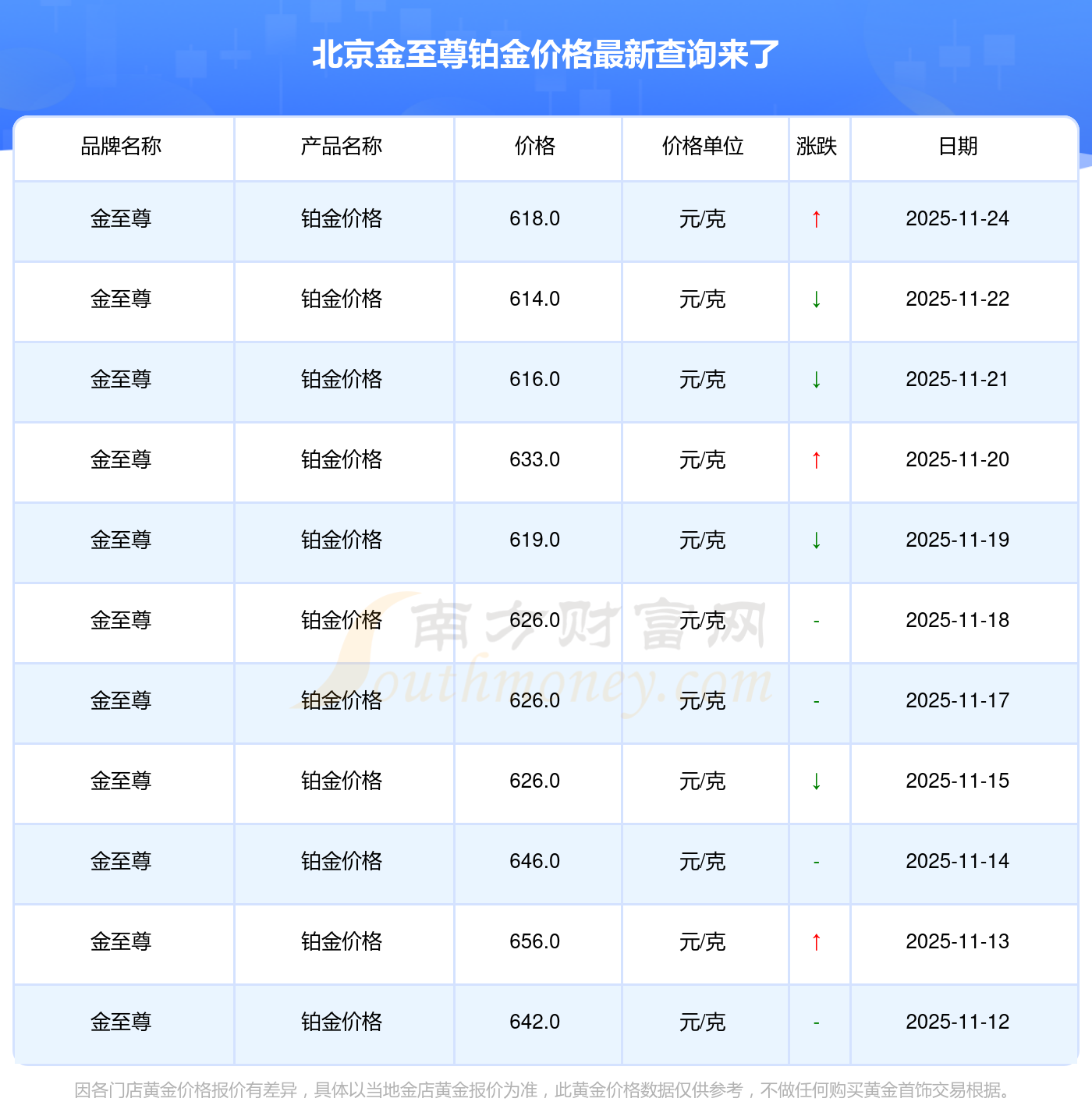 2025年11月24日,北京金至尊所售鉑金價格,其價格設(shè)定為 618.0元/克。