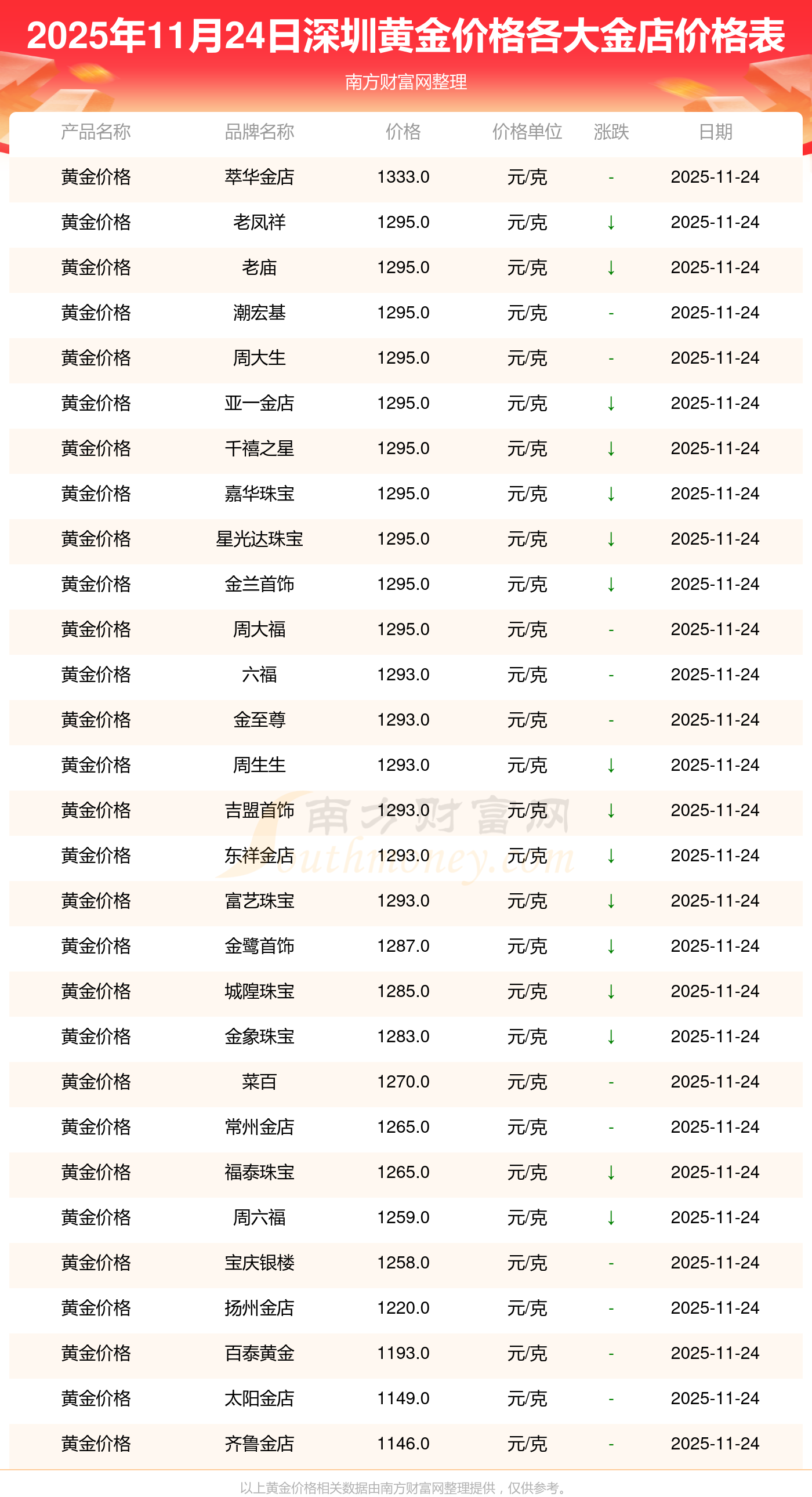 2025年11月24日深圳周大福、周大福、周大福、老鳳祥、老鳳祥、老鳳祥、周六福、周六福、周六福、周六福、六福等各大金店品牌黃金價(jià)格最新價(jià)格如下:周大福鉑金價(jià)格(香港)17630.0,周大福金條價(jià)格(香港)40570.0,周大福金條金價(jià)(內(nèi)地)1134.0元/克,老鳳祥黃金價(jià)格1295.0元/克,老鳳祥鉑金價(jià)格600.0元/克,老鳳祥足金價(jià)格1295.0元/克,周六福黃金價(jià)格1259.0元/克,周六福鉑金價(jià)格590.0元/克,周六福PT999鉑金價(jià)格590.0元/克,周六福金條價(jià)格1154.0元/克,六福黃金價(jià)格1293.0元/克。