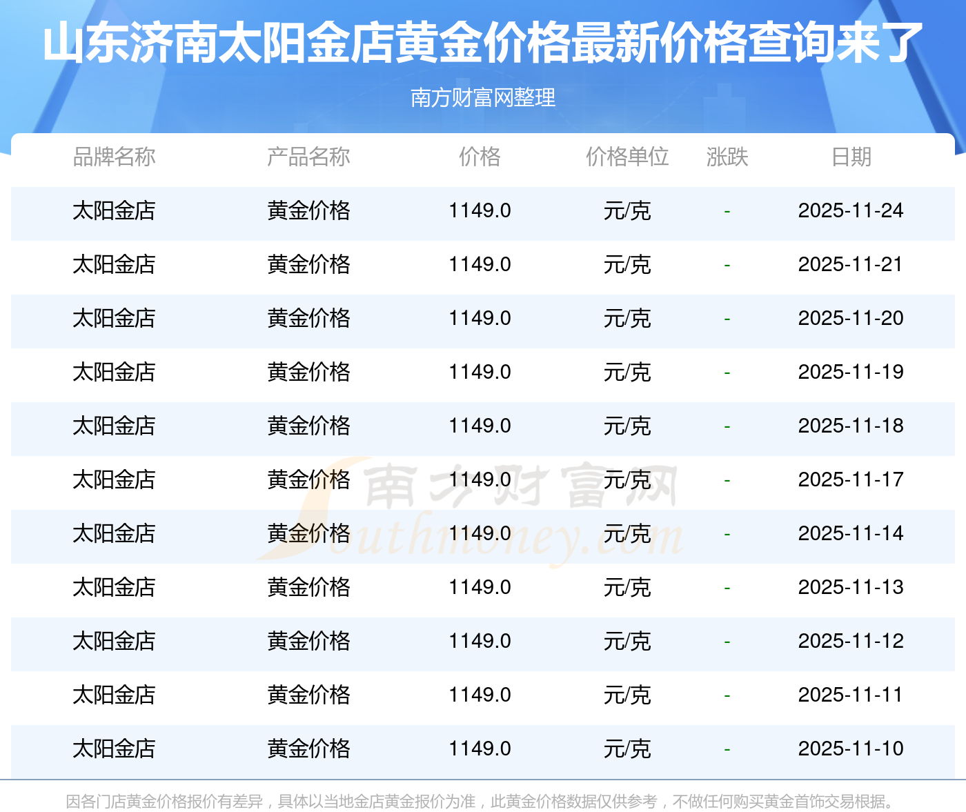 山東濟南太陽金店在 2025年11月24日,黃金價格的售賣價格是 1149.0元/克。