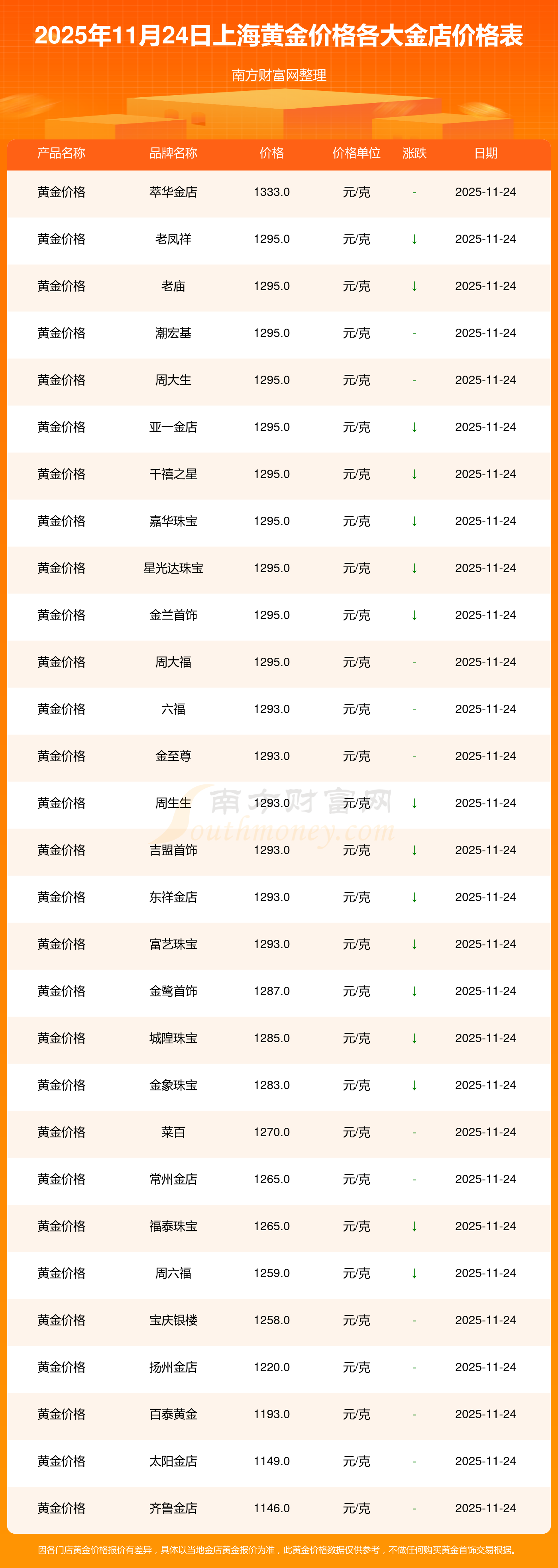 2025年11月24日,上海周大福、周大福、周大福、老鳳祥、老鳳祥、老鳳祥、周六福、周六福、周六福、周六福、六福等各大金店品牌黃金價(jià)格今日價(jià)格如下:周大福17630.0、周大福40570.0、周大福1134.0元/克、老鳳祥1295.0元/克、老鳳祥600.0元/克、老鳳祥1295.0元/克、周六福1259.0元/克、周六福590.0元/克、周六福590.0元/克、周六福1154.0元/克、六福1293.0元/克。