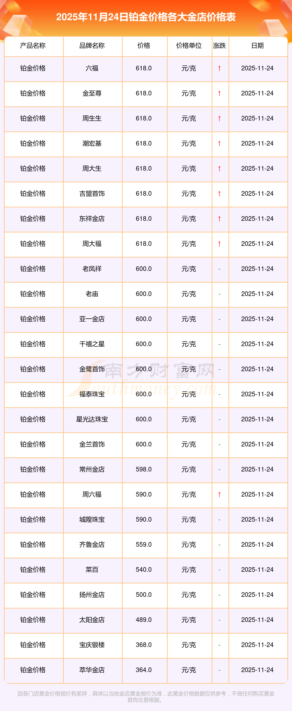 2025年11月24日各大金店鉑金價(jià)格最新價(jià)格:周大福17630.0,周大福40570.0,周大福1134.0元/克,老鳳祥1295.0元/克,老鳳祥600.0元/克,老鳳祥1295.0元/克,周六福1259.0元/克,周六福590.0元/克,周六福590.0元/克,周六福1154.0元/克,六福1293.0元/克。