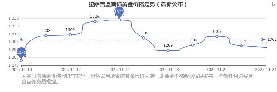 今日(2025年11月24日),拉薩吉盟首飾黃金價(jià)格每克的價(jià)值為1293.0元/克。