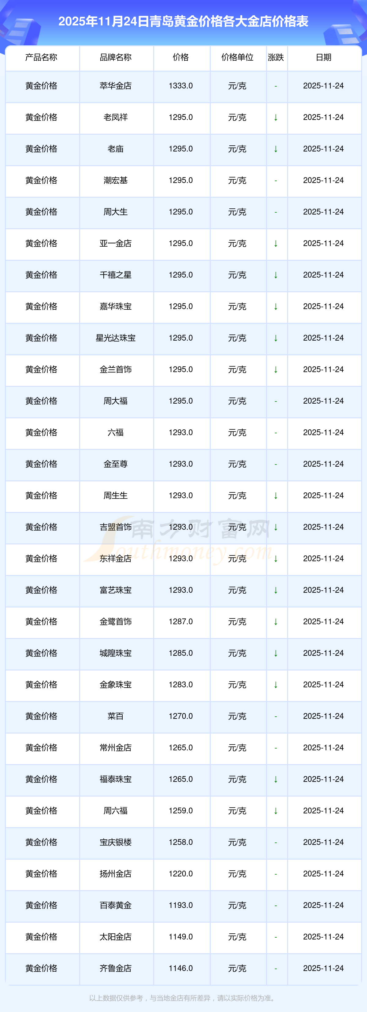 2025年11月24日青島周大福、周大福、周大福、老鳳祥、老鳳祥、老鳳祥、周六福、周六福、周六福、周六福、六福等各大金店品牌黃金價格最新價格如下:周大福鉑金價格(香港)17630.0,周大福金條價格(香港)40570.0,周大福金條金價(內(nèi)地)1134.0元/克,老鳳祥黃金價格1295.0元/克,老鳳祥鉑金價格600.0元/克,老鳳祥足金價格1295.0元/克,周六福黃金價格1259.0元/克,周六福鉑金價格590.0元/克,周六福PT999鉑金價格590.0元/克,周六福金條價格1154.0元/克,六福黃金價格1293.0元/克。