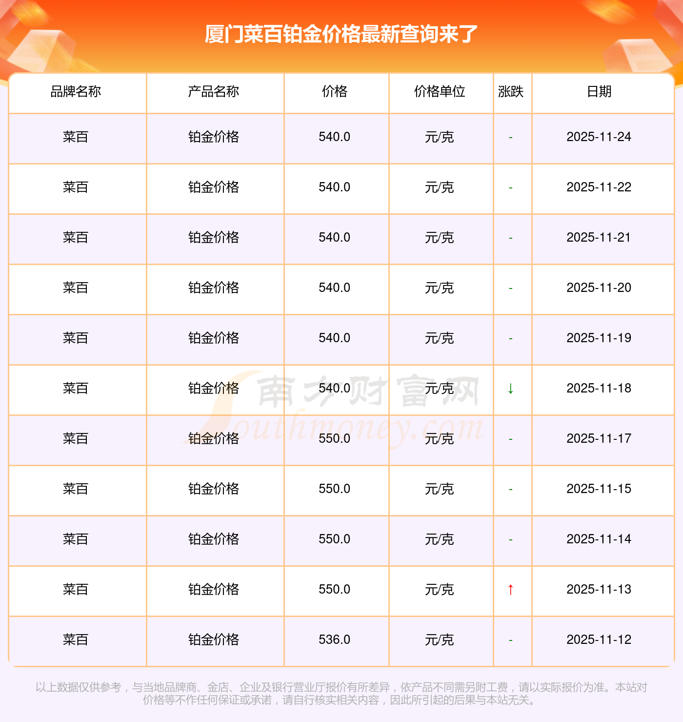 今日(2025年11月24日)廈門菜百鉑金價(jià)格最新價(jià)格為540.0元/克。