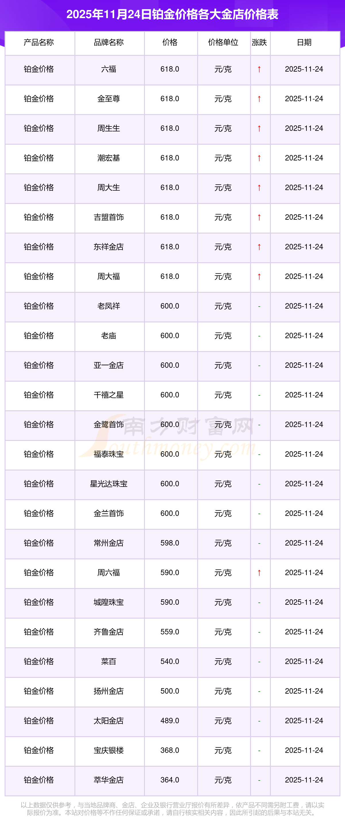 各大金店鉑金價格最新價格公布,2025年11月24日各大金店鉑金價格多少錢一克?