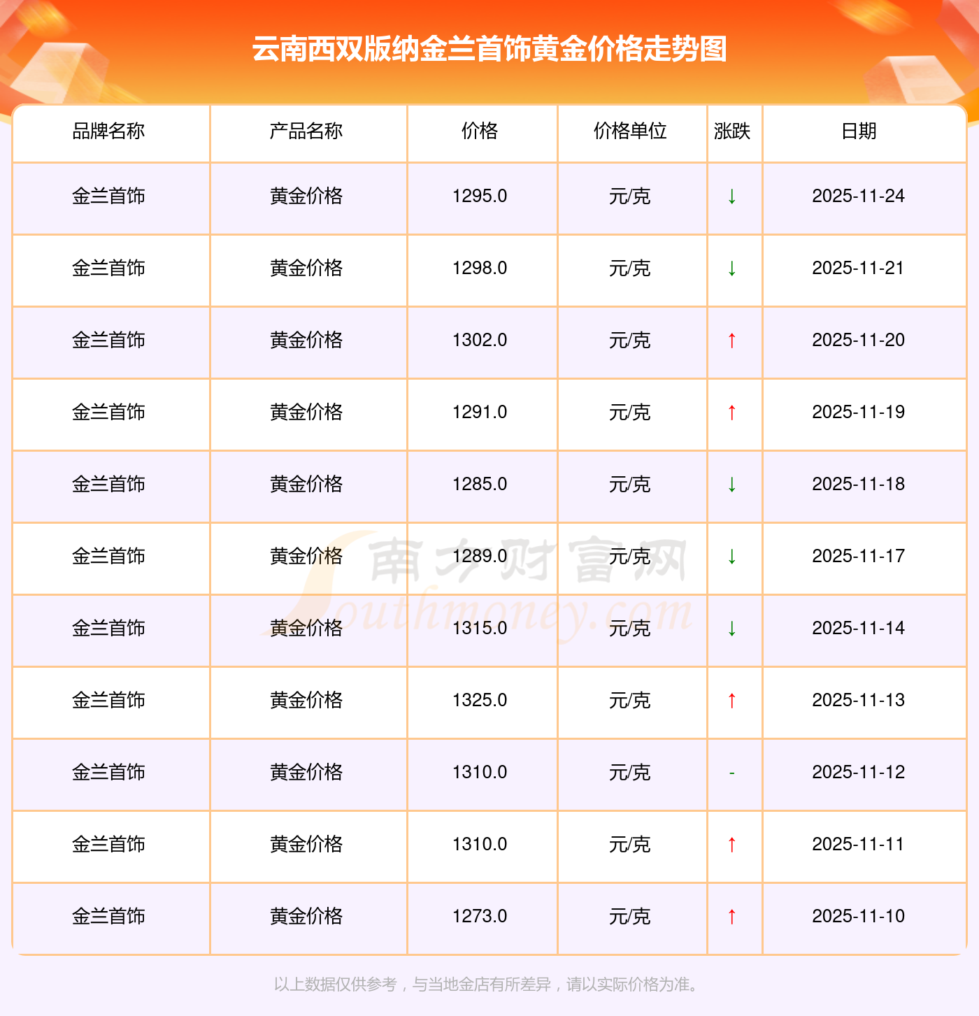 一、云南西雙版納金蘭首飾黃金價(jià)格表來了