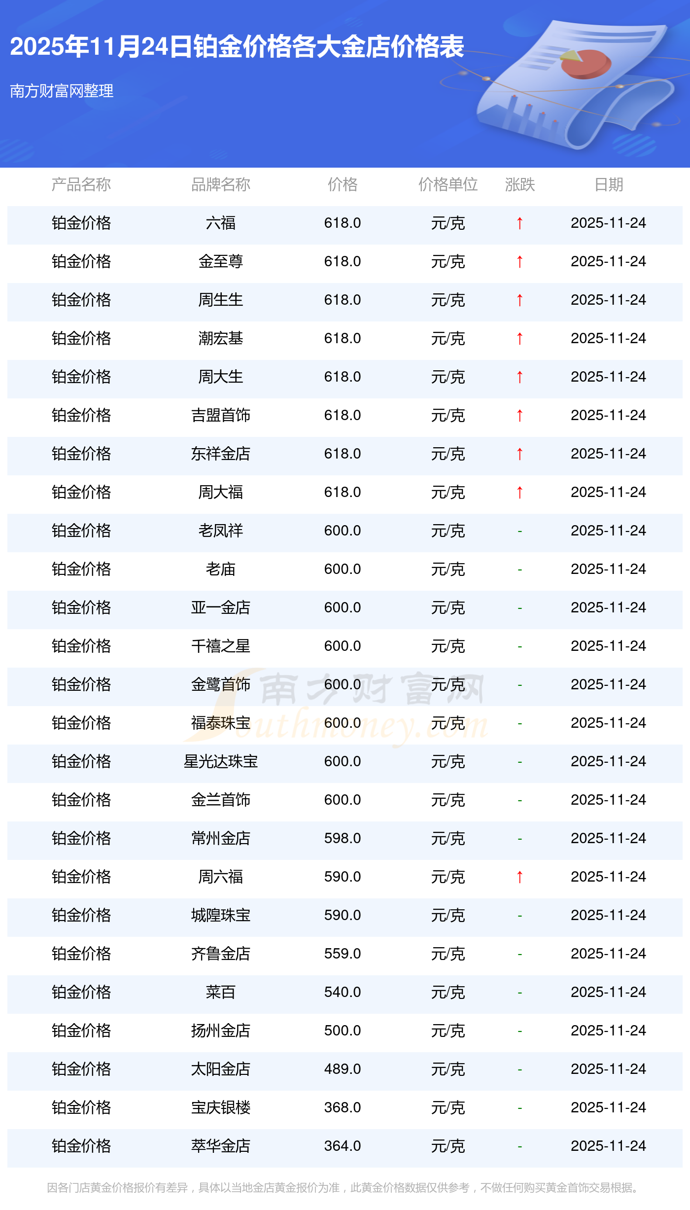 2025年11月24日,周大福、周大福、周大福、老鳳祥、老鳳祥、老鳳祥、周六福、周六福、周六福、周六福、六福等各大金店品牌鉑金價(jià)格今日價(jià)格如下:周大福17630.0、周大福40570.0、周大福1134.0元/克、老鳳祥1295.0元/克、老鳳祥600.0元/克、老鳳祥1295.0元/克、周六福1259.0元/克、周六福590.0元/克、周六福590.0元/克、周六福1154.0元/克、六福1293.0元/克。