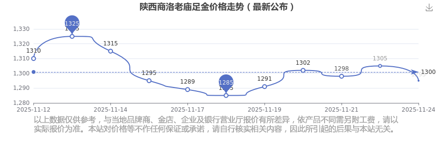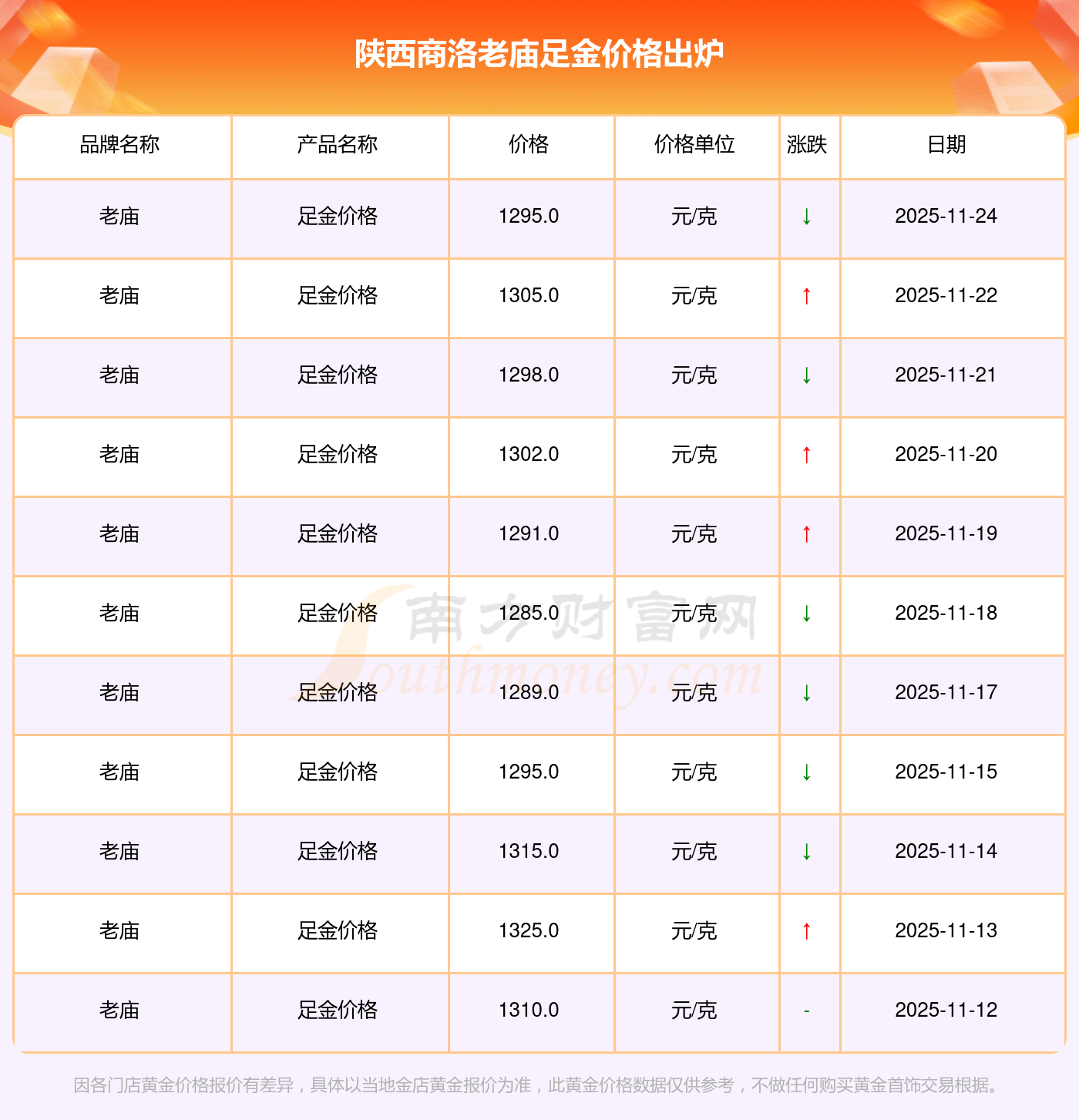 今日(2025年11月24日)陜西商洛老廟足金價(jià)格為1295.0元/克。